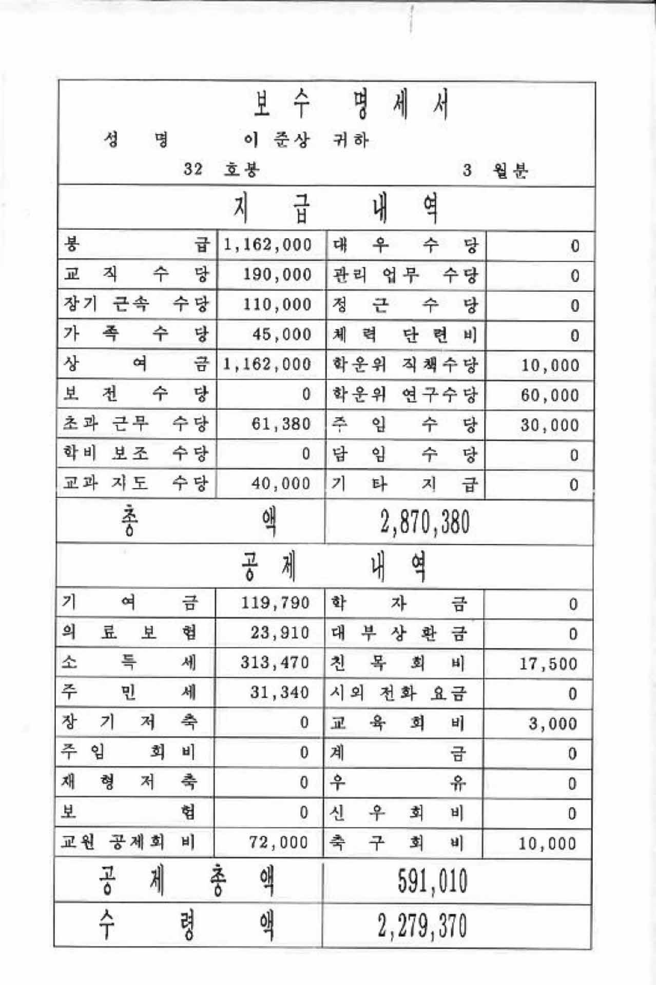• 1996년 3월 교사 봉급계산서