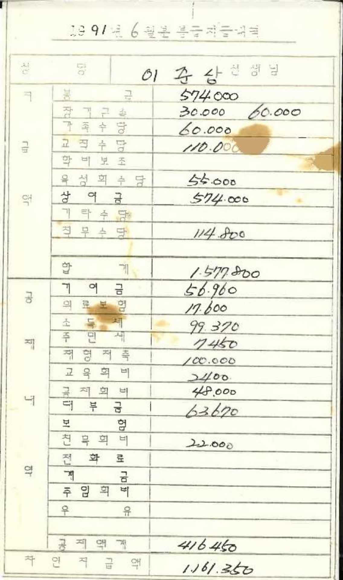 | 기록물명 | 1991년 6월 교사 봉급계산서 | ||