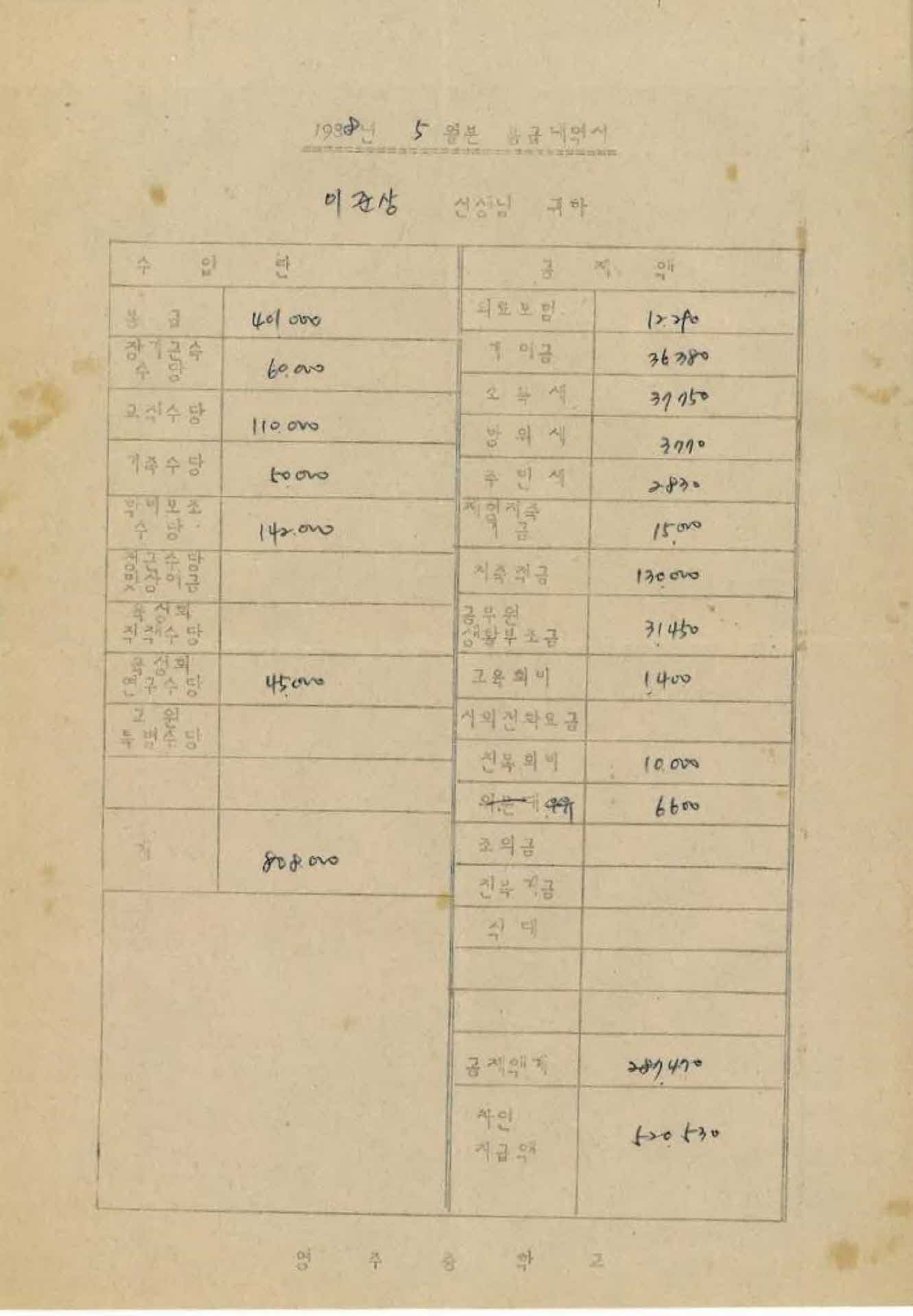 | 기록물명 | 1988년 5월 교사 봉급계산서 | ||