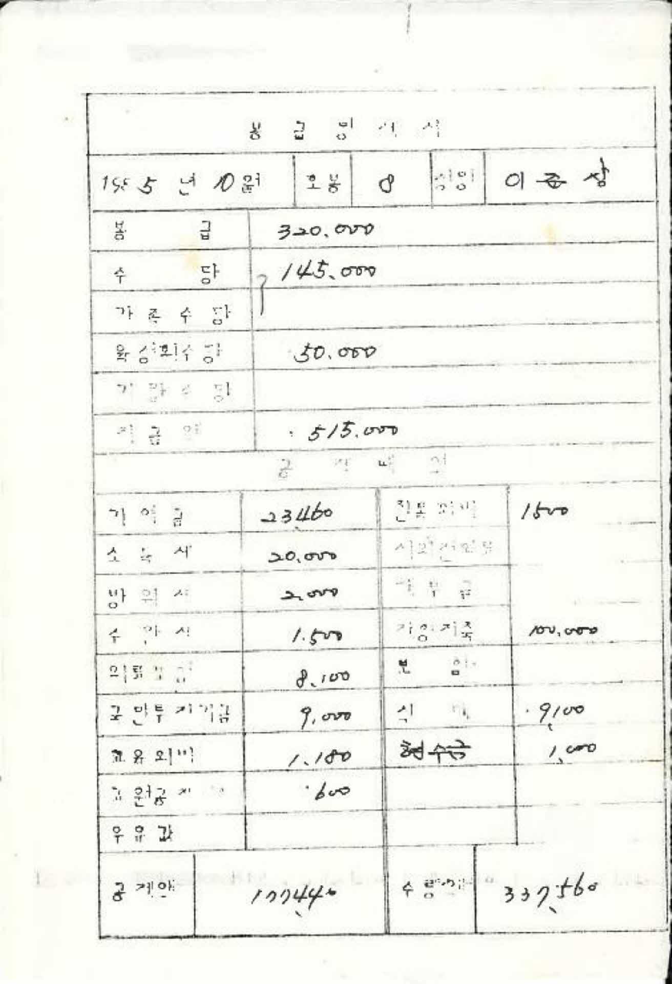 | 기록물명 | 1985년 10월 교사 봉급계산서 | ||