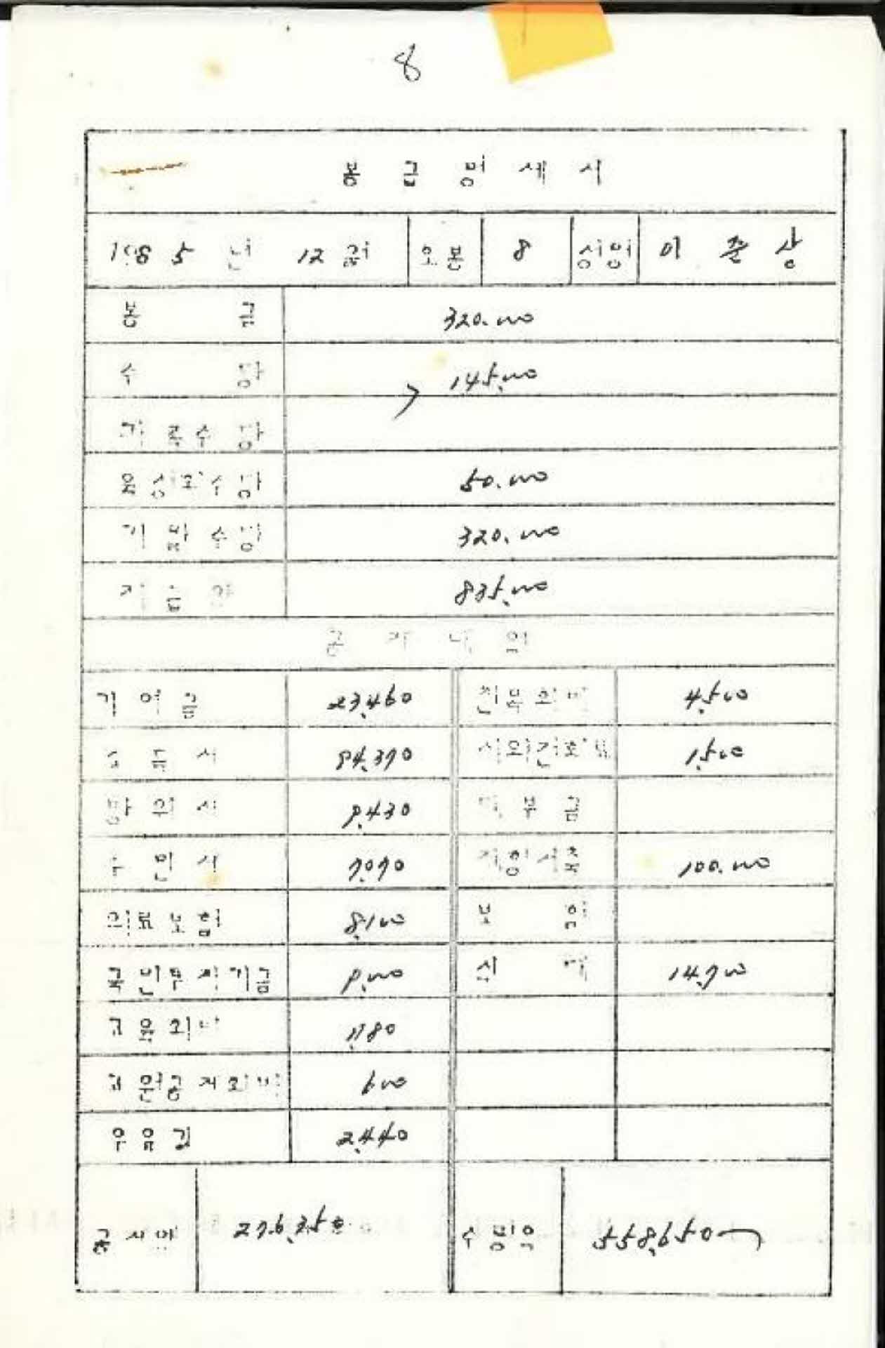 | 기록물명 | 1985년 12월 교사 봉급계산서 | ||
