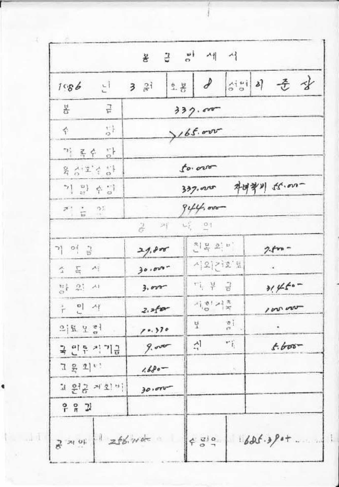 1986년 3월 교사 봉급계산서