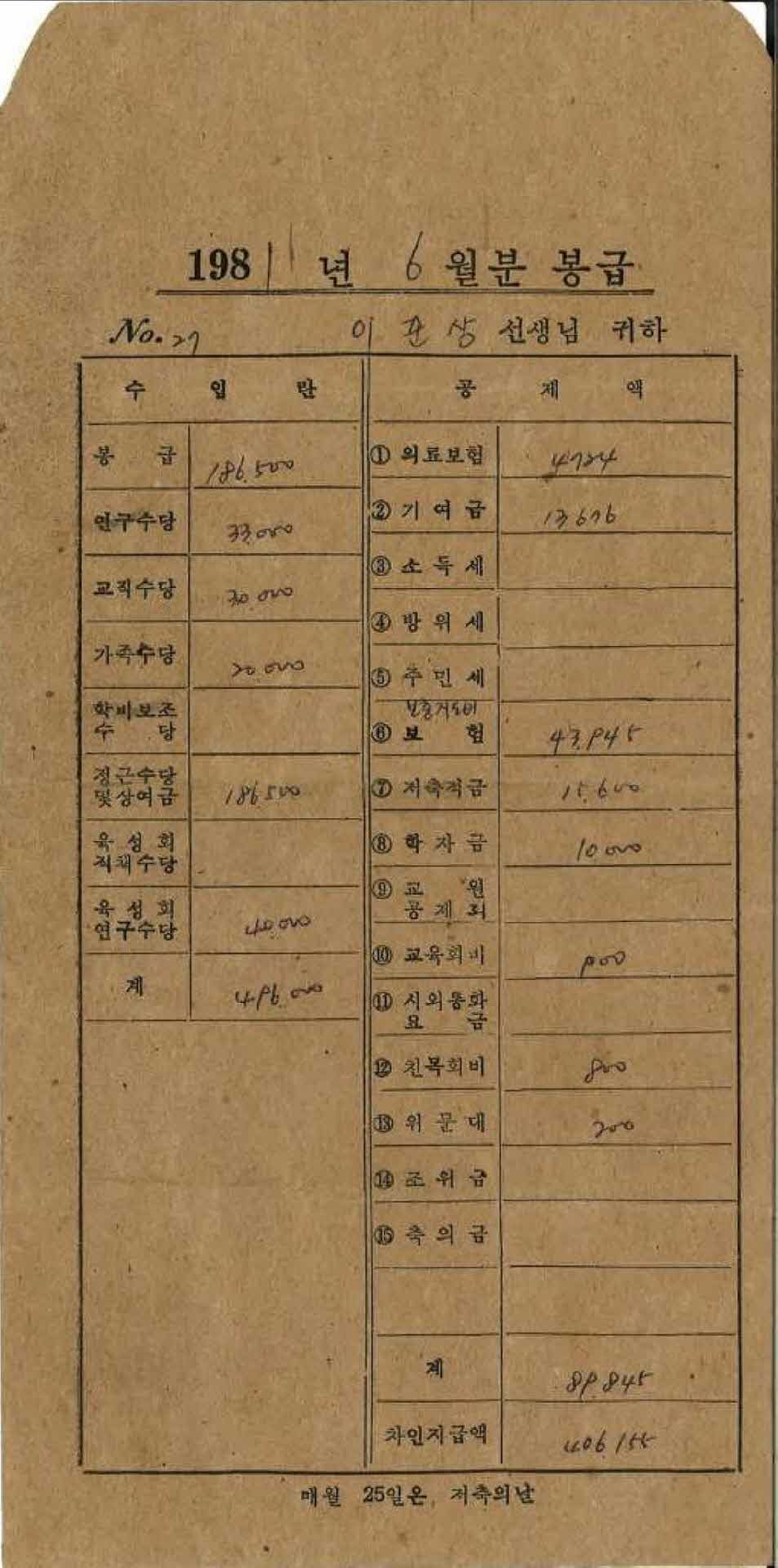 | 기록물명 | 1981년 6월 교사 봉급계산서 봉투 | ||