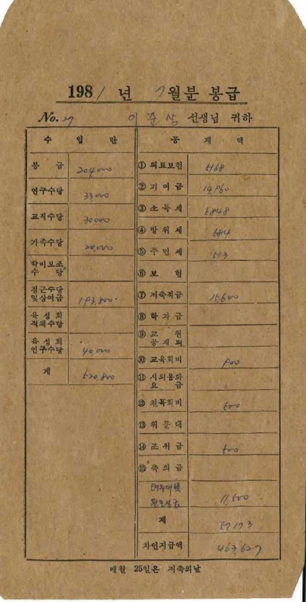 | 기록물명 | 1981년 7월 교사 봉급계산서 봉투 | ||