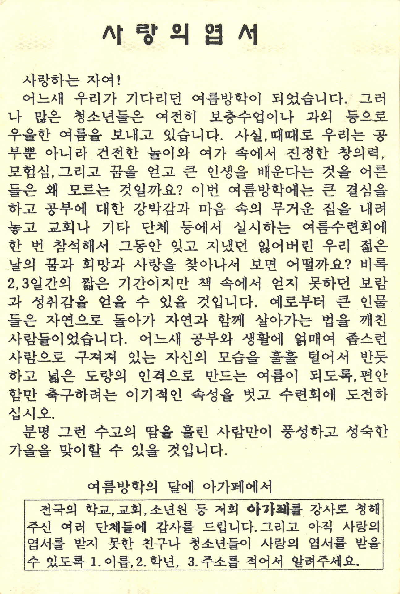 아가페청소년선교회 사랑의엽서(96년 7월20일)