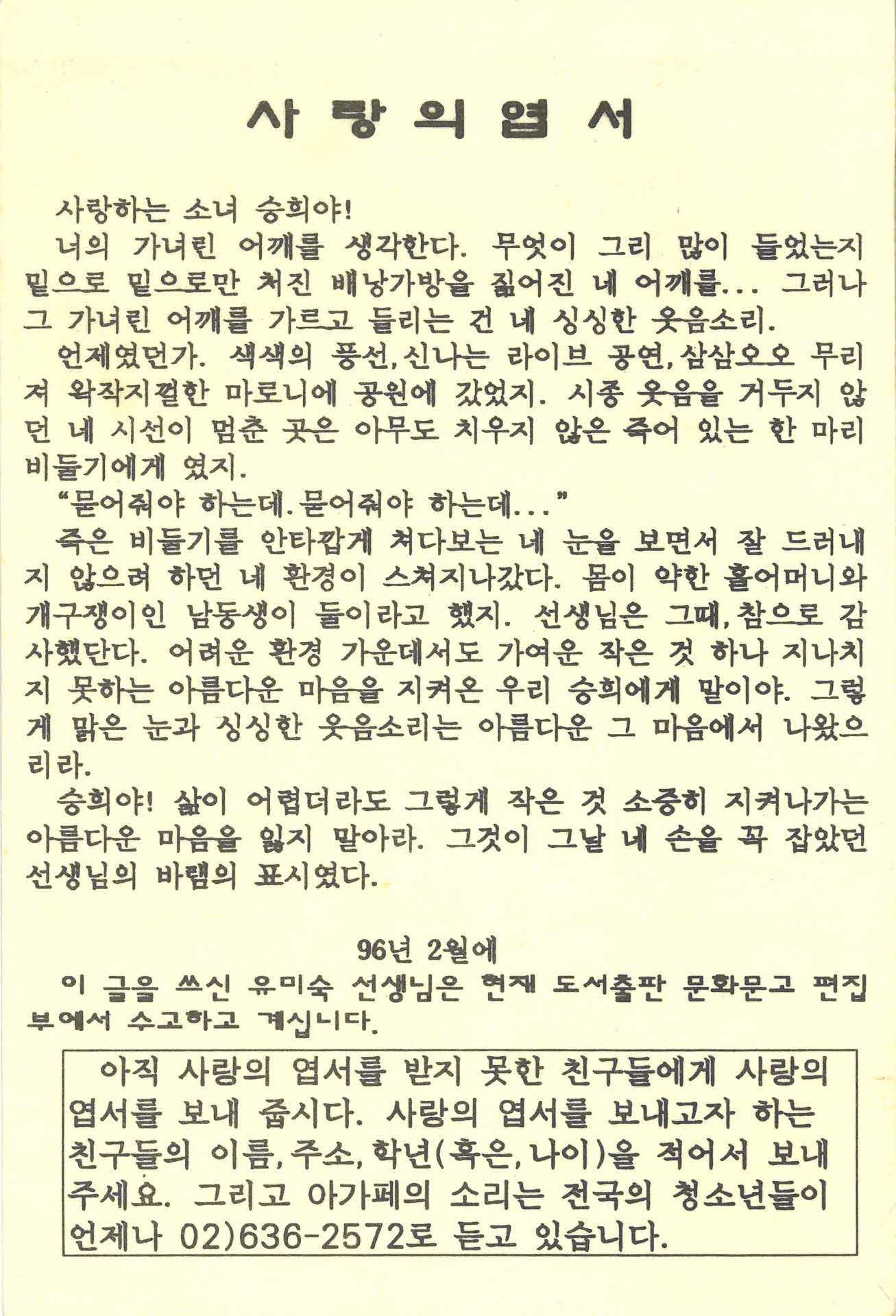 아가페청소년선교회 사랑의엽서(96년2월20일)