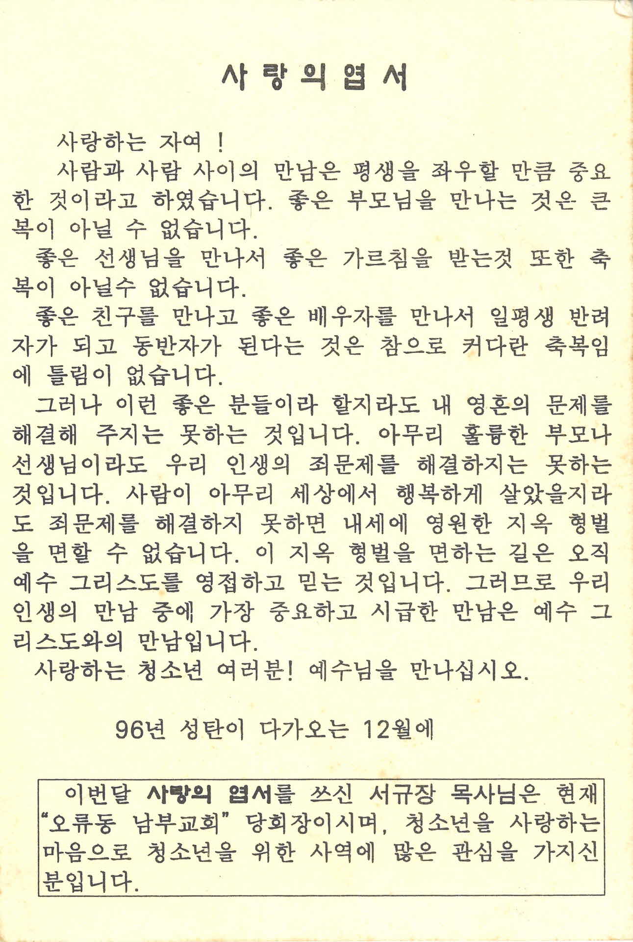 아가페청소년선교회 사랑의엽서(96년12월11일)