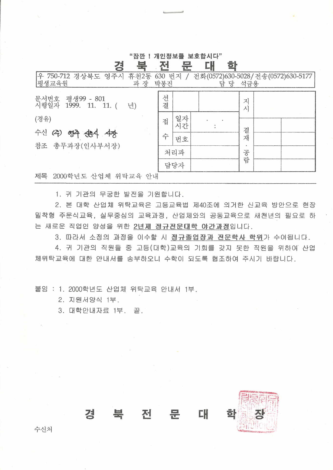 경북전문대 2000학년도 산업체 위탁교육 안내 공문