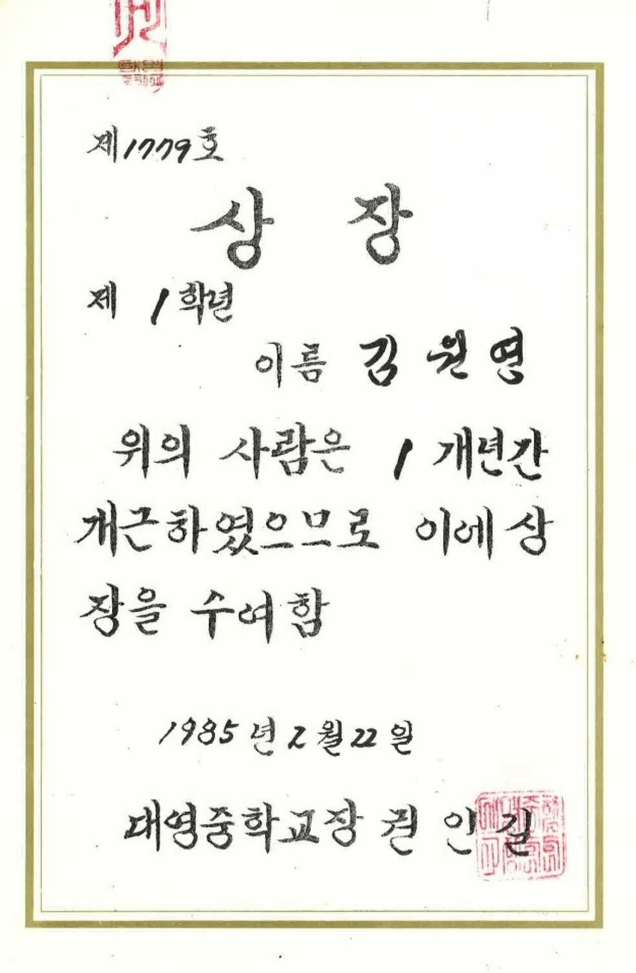 | 기록물명 | 1985년 대영중 1년 개근상 | ||