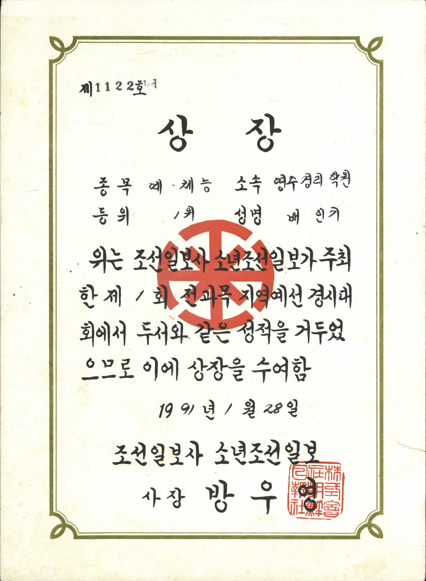 | 기록물명 | 제1회 전과목 지역예선 경시대회 상장 | ||