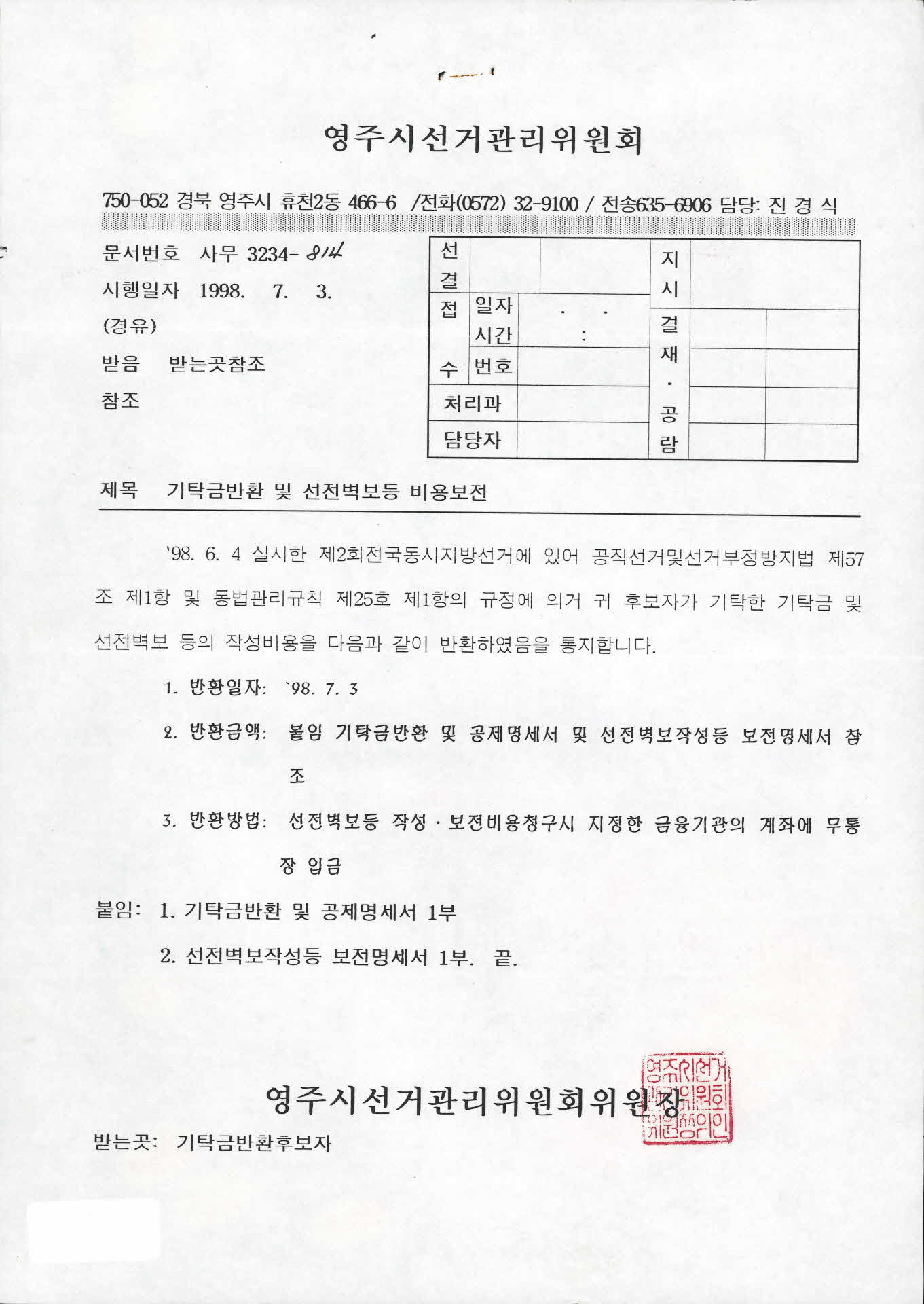 기록물명 기탁금반환 및 선전벽보등 비용보전
