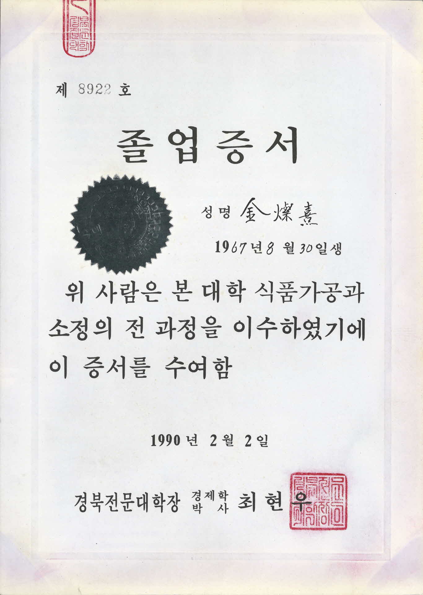 | 기록물명 | 경북전문대학 식품가공과 과정 이수 졸업장 | ||