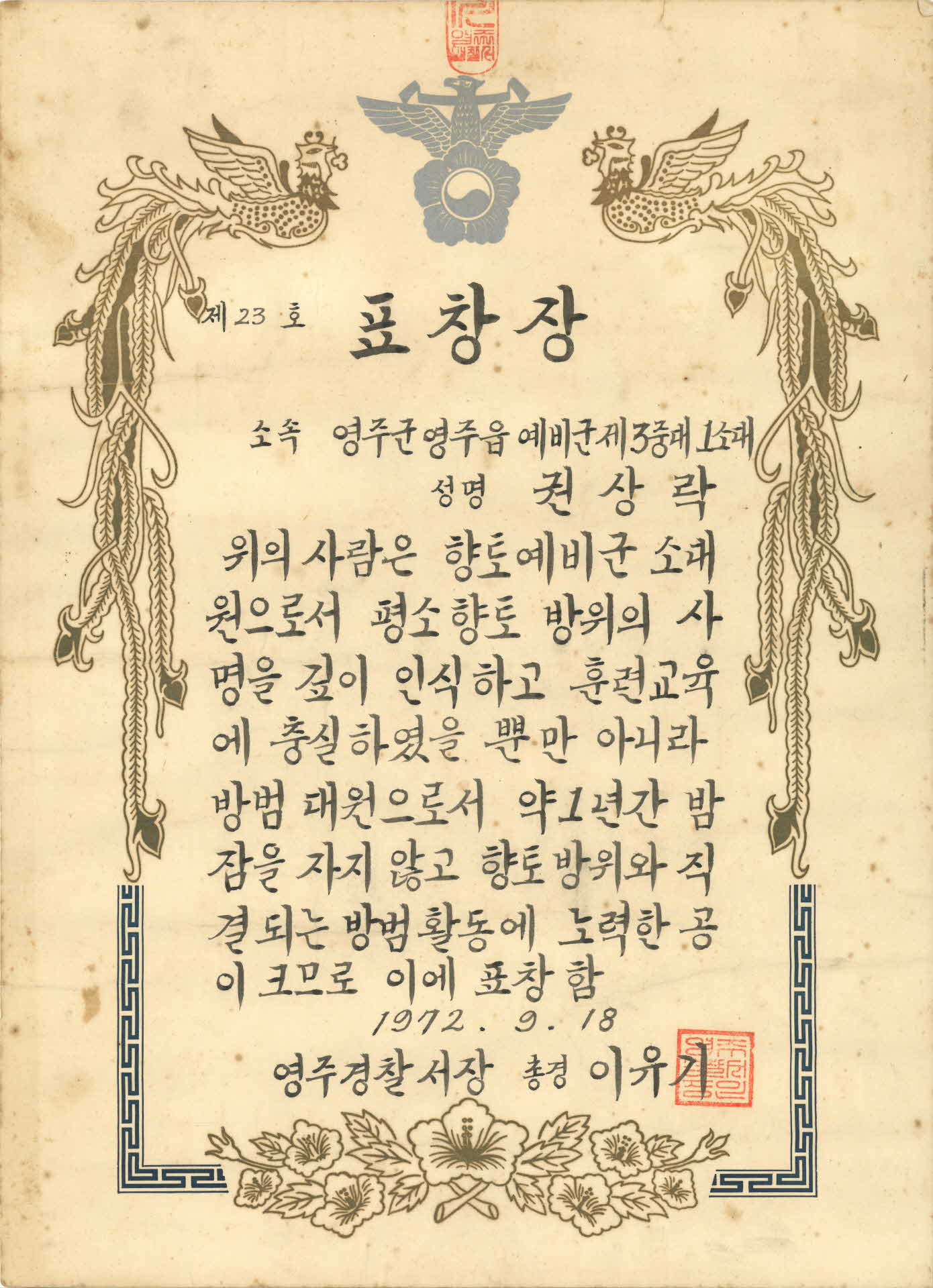 | 기록물명 | 향토방위 및 방범 표창장 | ||