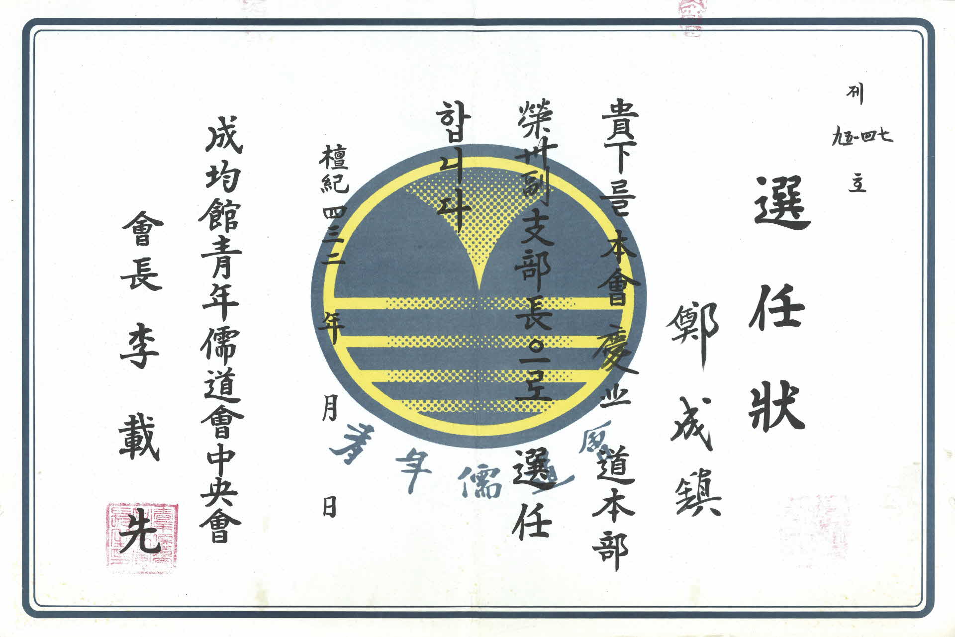청년유도회 영주 지부장 선임장