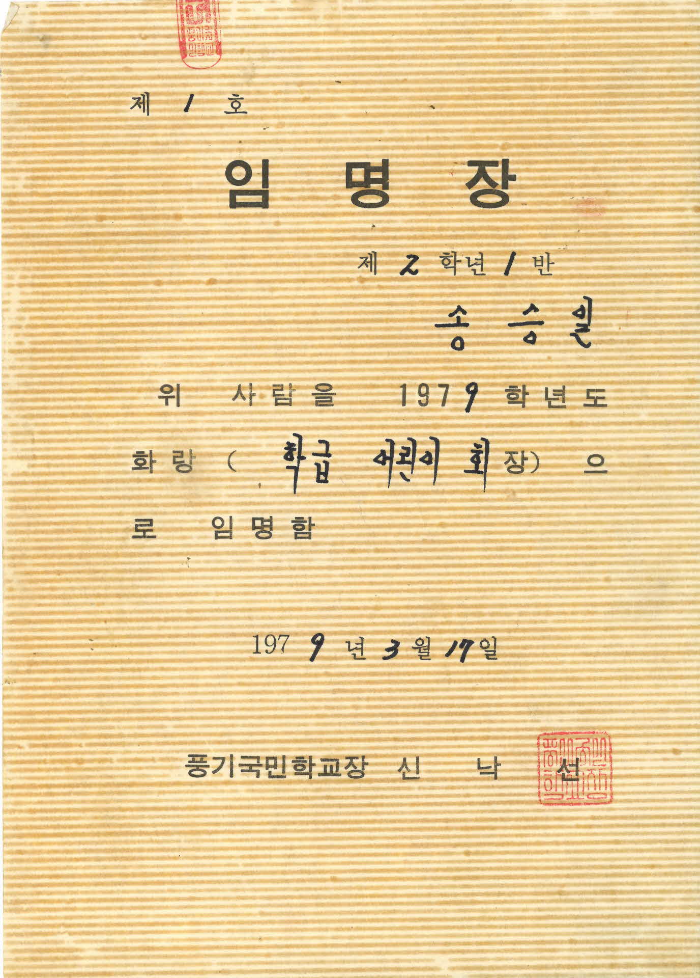 이 표창장은 1979년 3월 17일 풍기국민학교장 신낙선이 1979학년도 화랑 학급 어린이 회장으로 임명된 제2학년 1반 송승일 학생에게 발급한 것이다. 발급번호는 제1호이다. 풍기초등학교는 1908년 5월에 사립안정보통학교로 인가를 받아 같은 해 5월에 개교하였다. 1911년 3월에 사립안정보통학교로 교명이 개칭되었고, 그 이듬해인 1912년 4월에 공립으로 개편되어 교명을 풍기공립보통학교로 개칭하였다. 1938년 4월에 풍기공립심상소학교, 1941년 4월에 풍기공립국민학교로 개칭하였다. 1950년 7월에 6·25로 전소되었다가 이후에 교사를 신축하였고, 교명도 풍기국민학교로 개칭하였다. 1963년 3월에 풍기북부 초등학교와 분리하였다. 1996년 3월에 풍기초등학교로 개칭되었다. 1999년 9월에 창락초등학교를 통폐합하여 오늘에 이르고 있다.