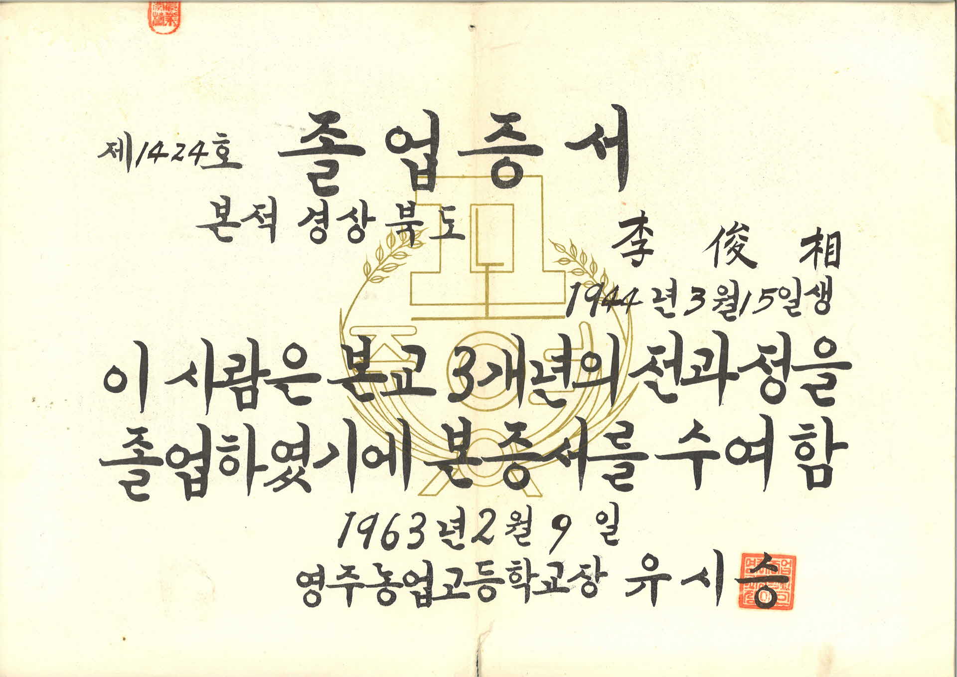 이 졸업증서는 1963년 2월 9일 영주농업고등학교장 유시승이 3년의 전과정을 졸업한 이준상(李俊相)에게 발급하였다. 영주농업학교는 1943년 3월 3일 설립인가를 득하고 그해 5월 5일 개교하였다. 1964년 12월 10일 영주종합고등학교로 교명을 변경하고, 1978년 3월 1일 영주공업고등학교로 다시 교명 변경, 2001년 3월 1일 영주중앙고등학교와 통합하여 영주제일고등학교로 교명을 변경하여 오늘에 이르고 있다. 졸업증서의 발급번호는 1424호이다.