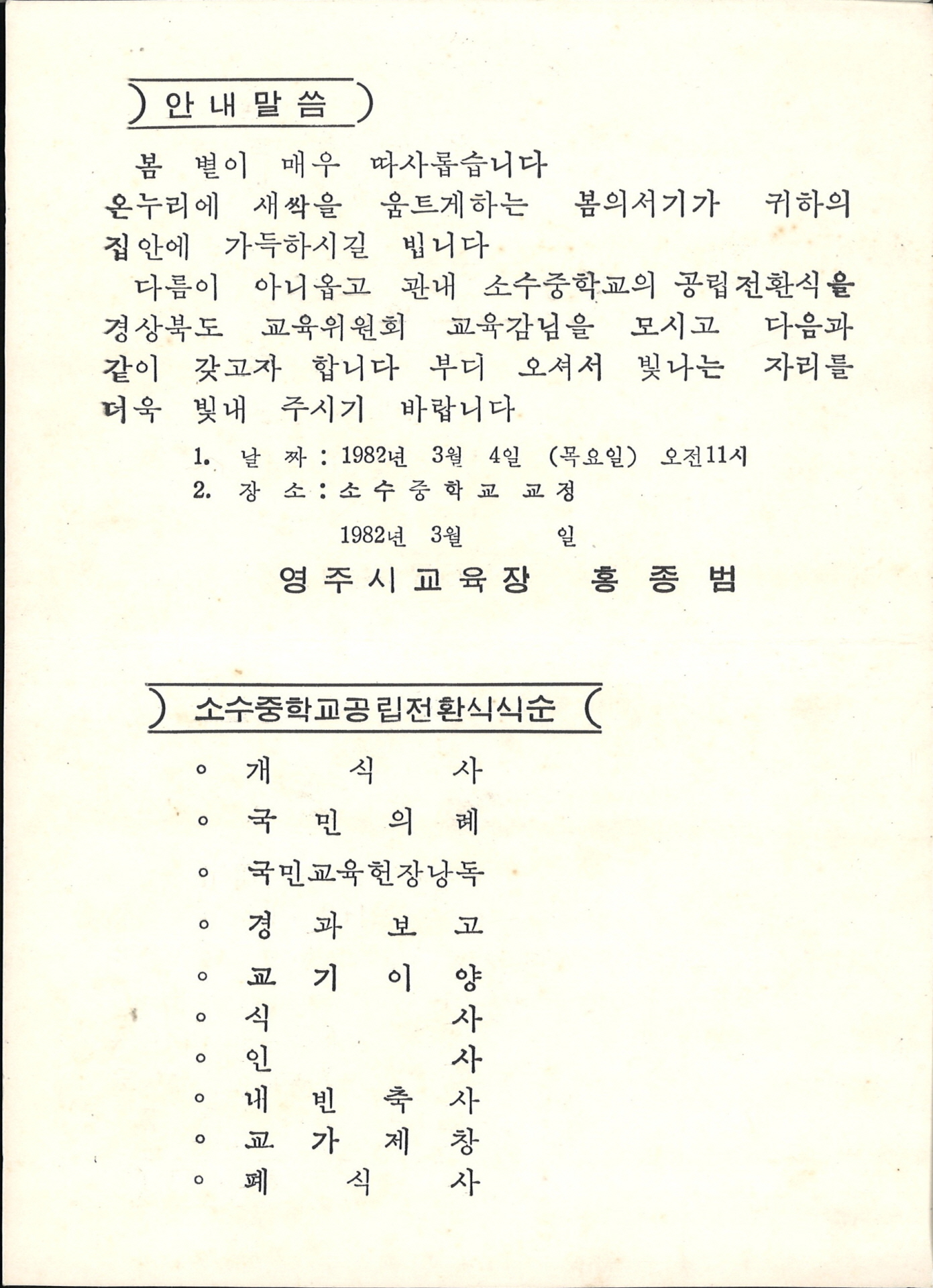 영주시교육장 명의로 보낸 소수중학교의 공립전환식 안내장이다. 일정은 19823411시이며, 장소는 소수중학교 교정이다.