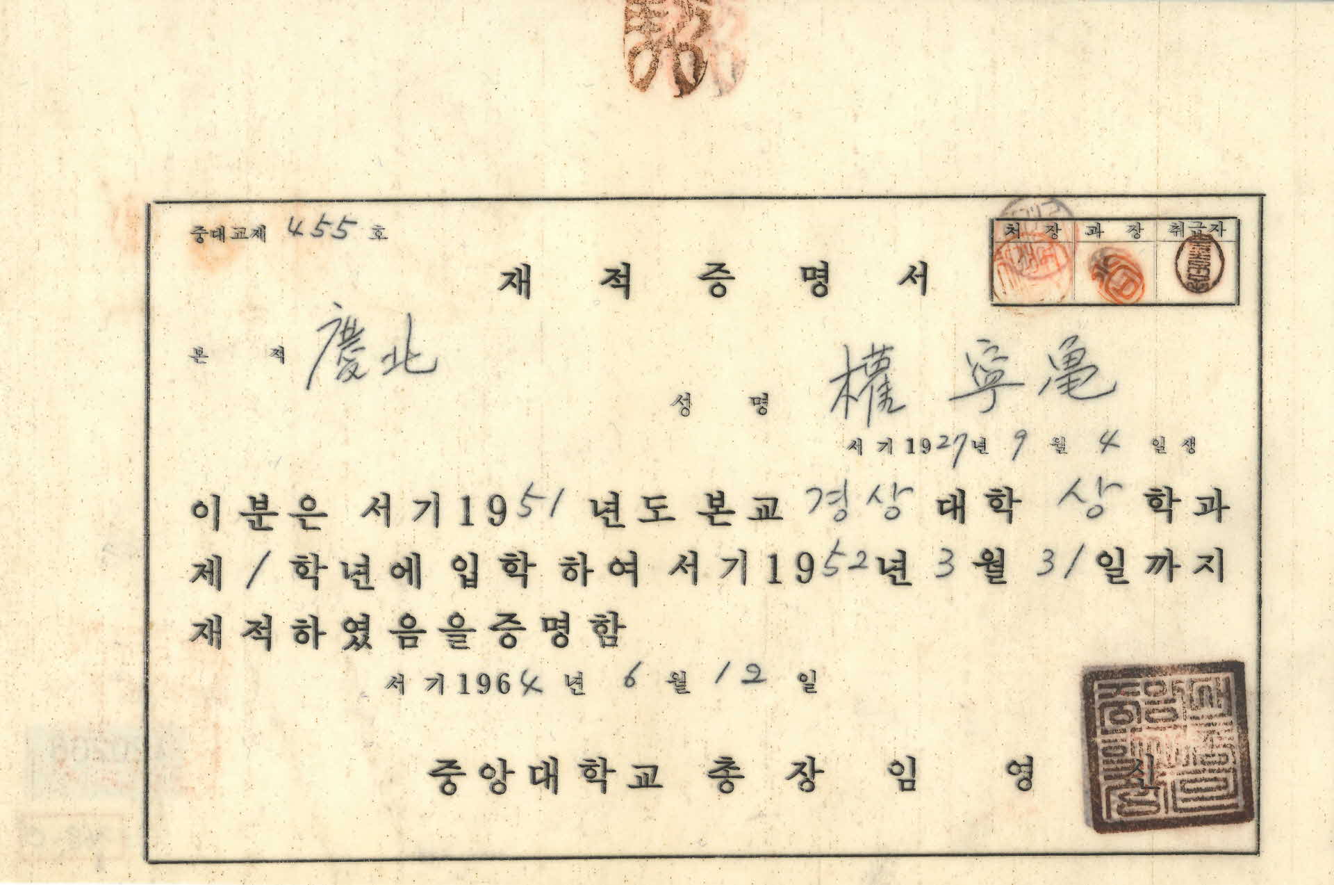 이 재적증명서(在籍證明書)는 중앙대학교 총장 임영신이 1964년 6월 12일 경상대학 상학과에 재학(1951년 입학~1952년 3월 30일)하였던 권영구(權寧龜)에게 발급한 것이다.