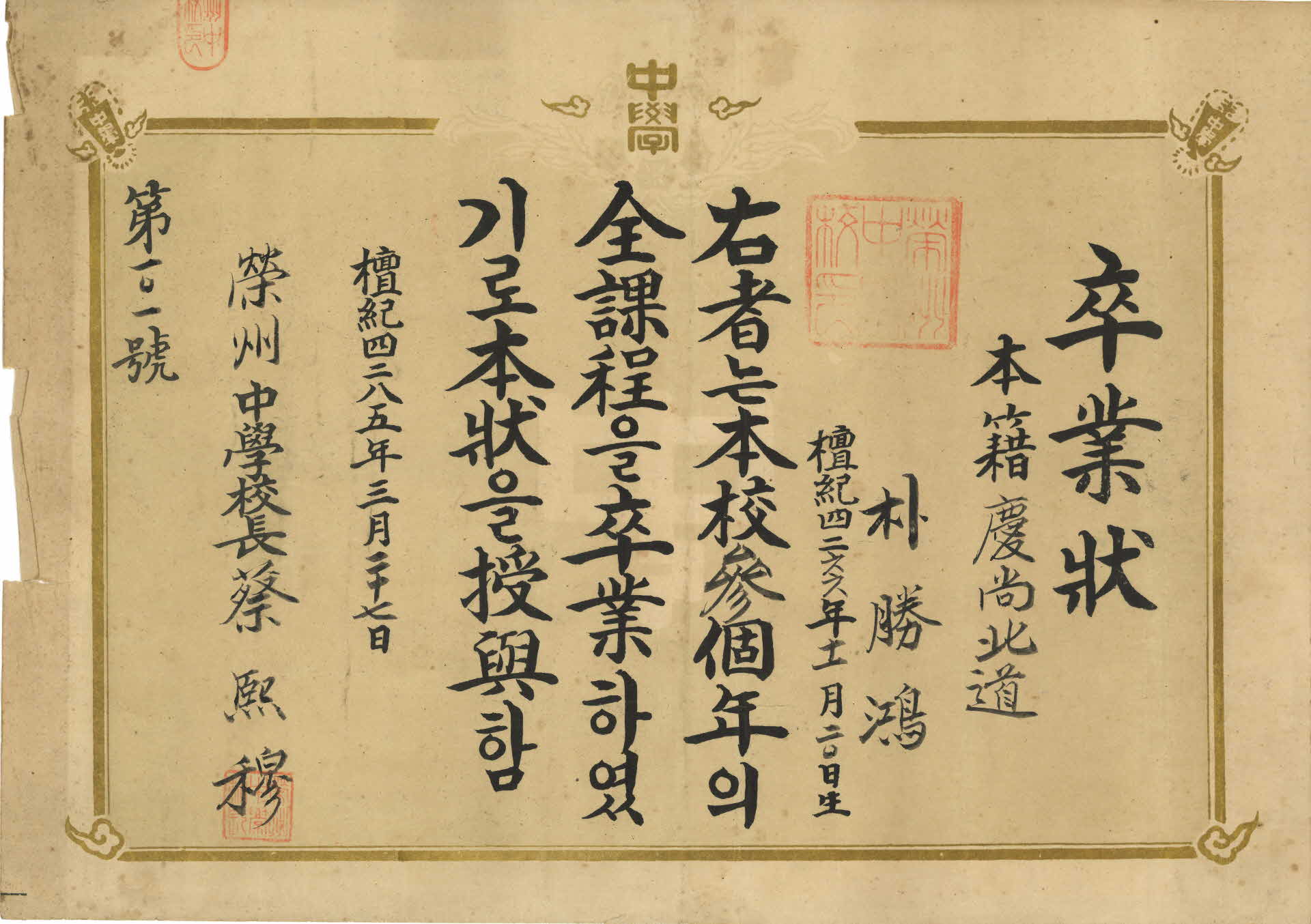 이 졸업장(卒業狀)은 증서 번호 제101호로 영주중학교장 채희목(蔡熙穆)이1952년 3월 27일 졸업생인 박승홍(朴勝鴻) 학생에게 발급한 것이다. 수업연한은 3년이고, 졸업장에는 본적(本籍)과 생년월일이 기재되어 있다.