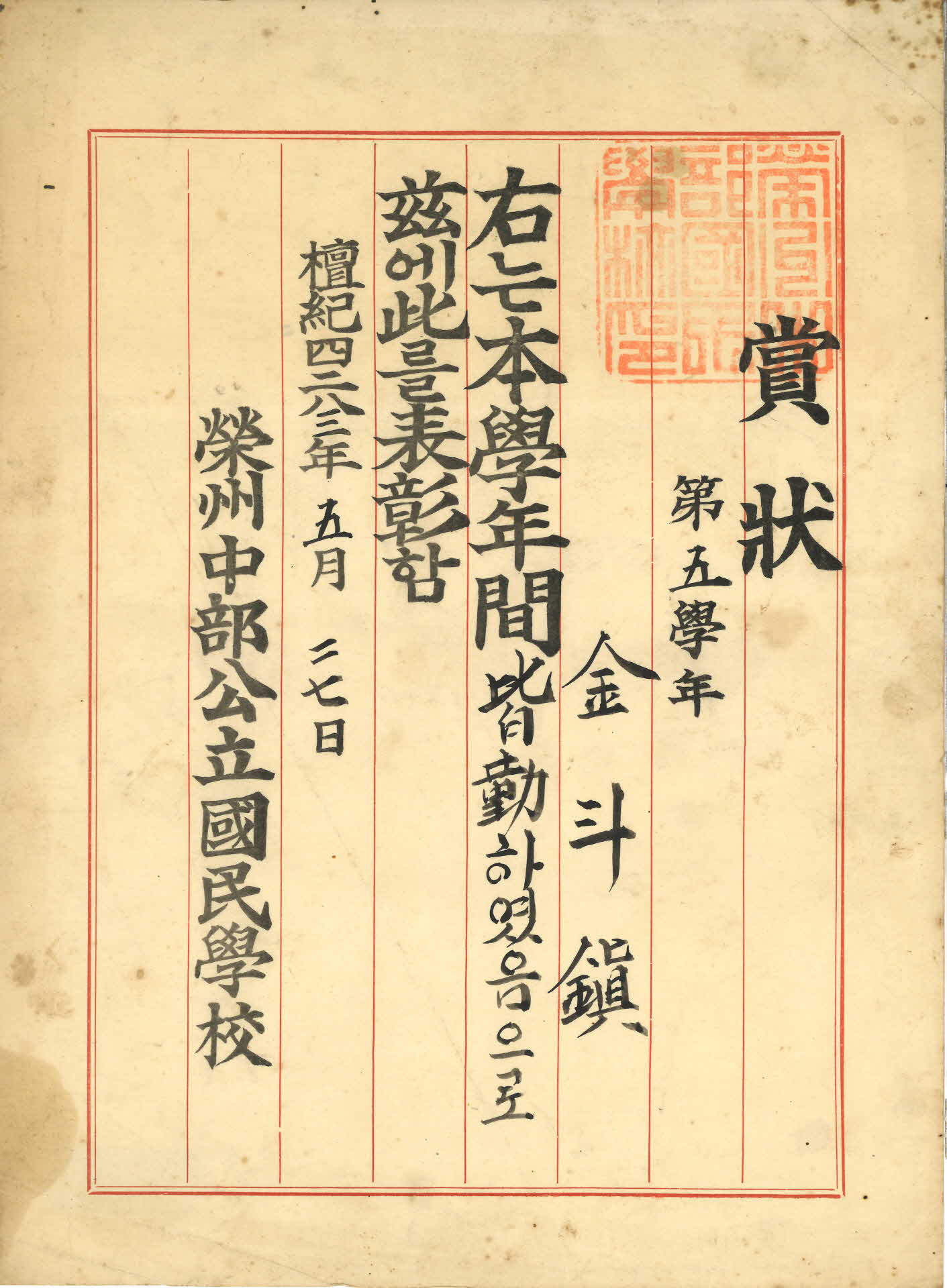이 상장(賞狀)은 영주중부공립국민학교(榮州中部公立國民學校)에서 1950년 5월 27일 1년 개근(皆勤)한 5학년 김두진(金斗鎭) 학생에게 발급한 것이다.