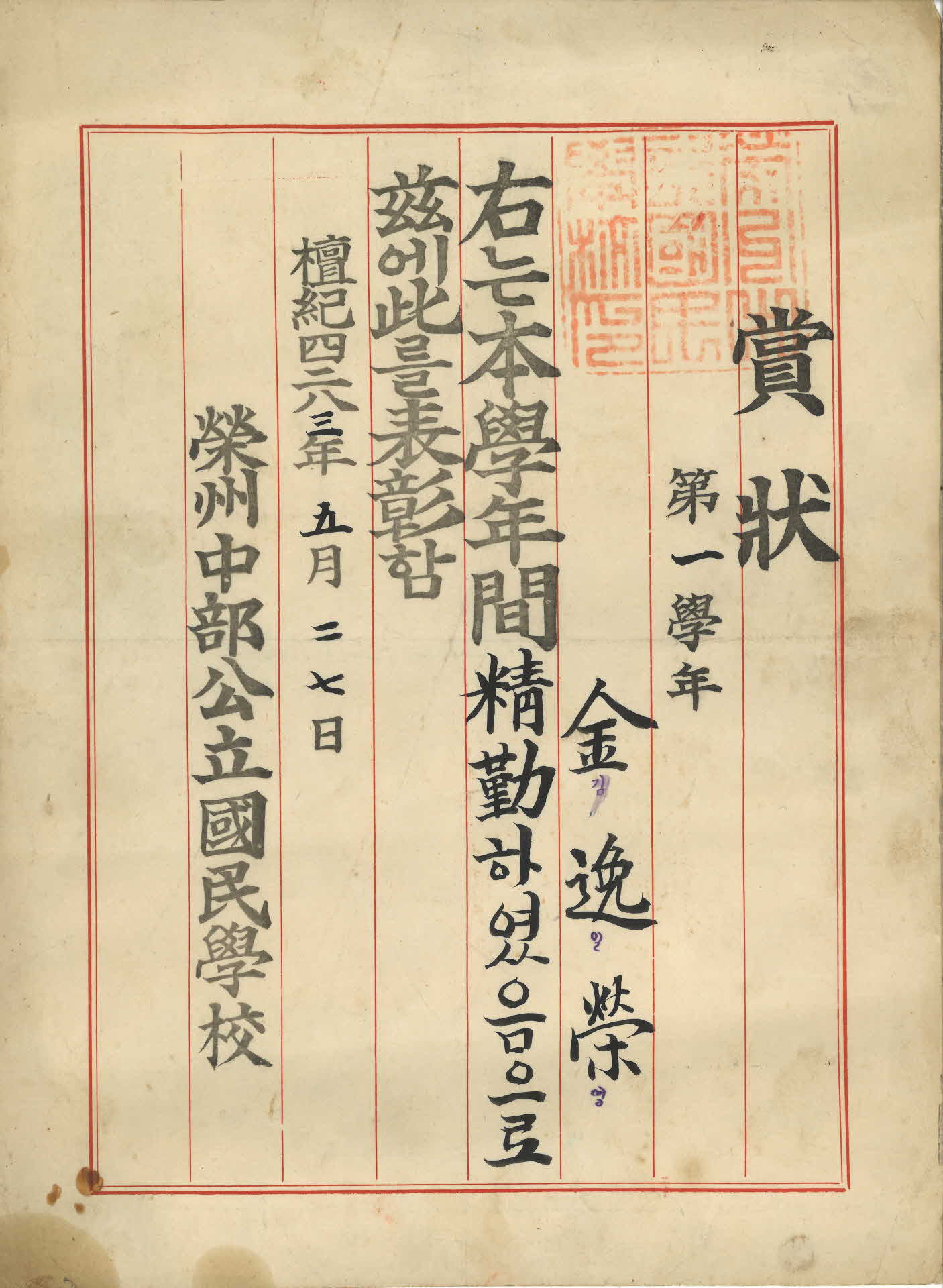 이 상장(賞狀)은 영주중부공립국민학교(榮州中部公立國民學校)에서 1950년 5월 27일 1년 개근(皆勤)한 1학년 김일영(金逸榮) 학생에게 발급 된 것이다.