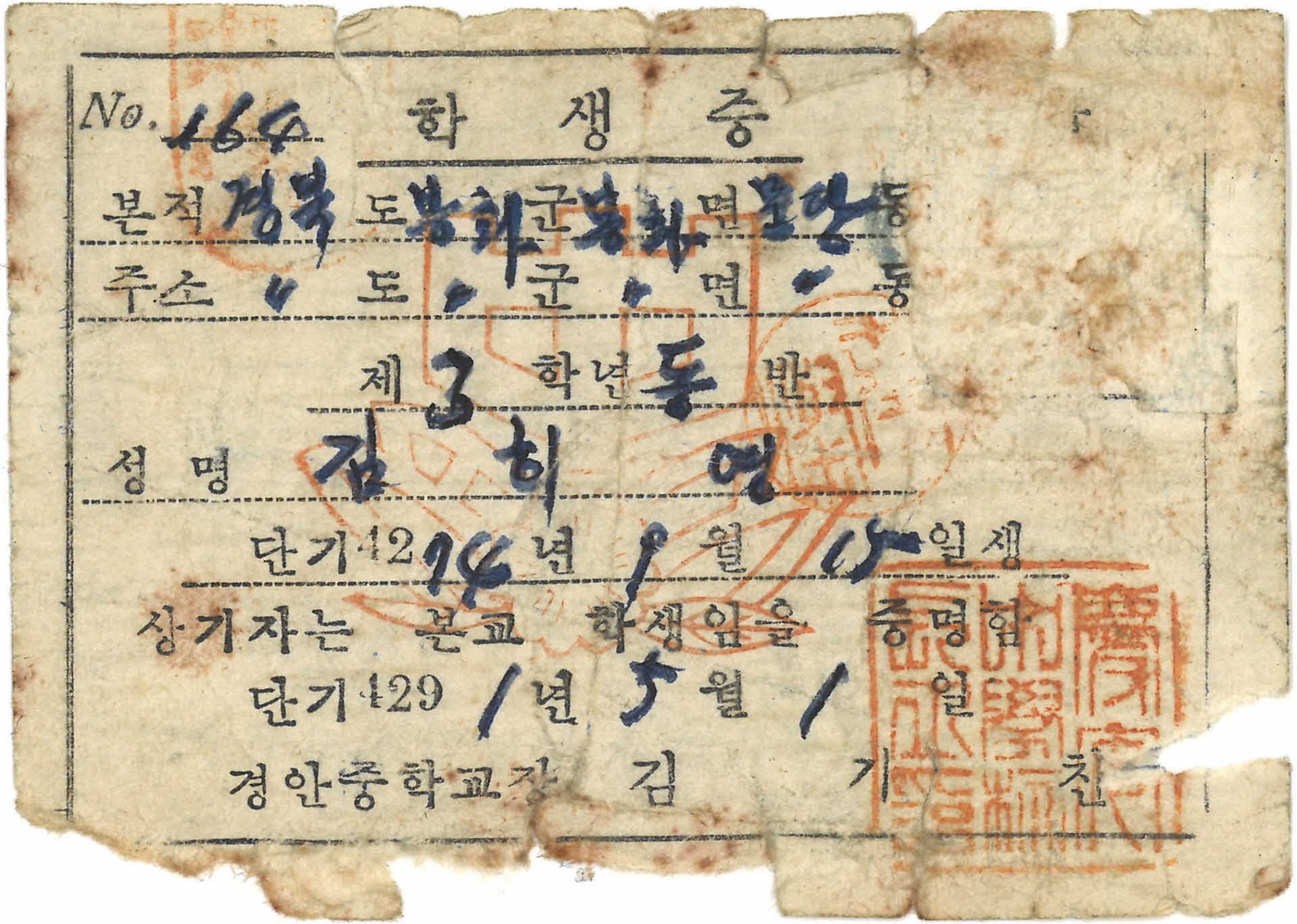 이 학생증은 1958년 5월 1일 경안중학교장 김기찬이 3학년 동반 김희영 학생에게 발급한 것이다. 발급번호는 164번이고 주소는 봉화군 봉화읍 문단이고 생년은 1941년생이다. 뒷장에는 공납금 납부증이 분기별 월별로 표로 기록되어 있다. 경안중학교는 1951년 9월 27일 영주에서 개교하여 1962년 영광중학교로 교명이 변경되었다.
