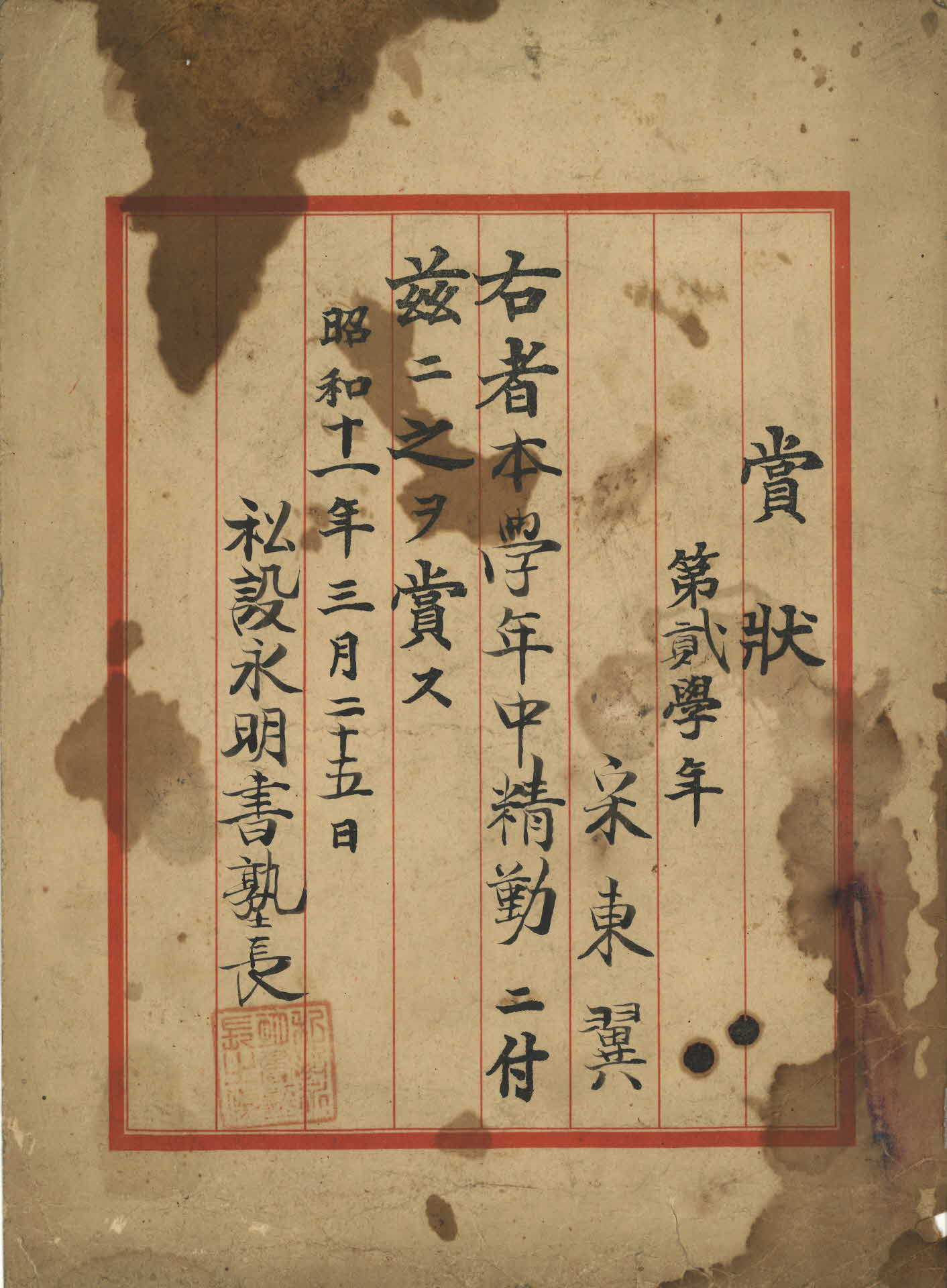 이 상장(賞狀)은 일제강점기인 1936년(소화 11) 3월 25일 사설(私設) 영명서숙(永明書塾)에서 2학년 송동익(宋東翼) 학생에게 발급한 것이다.