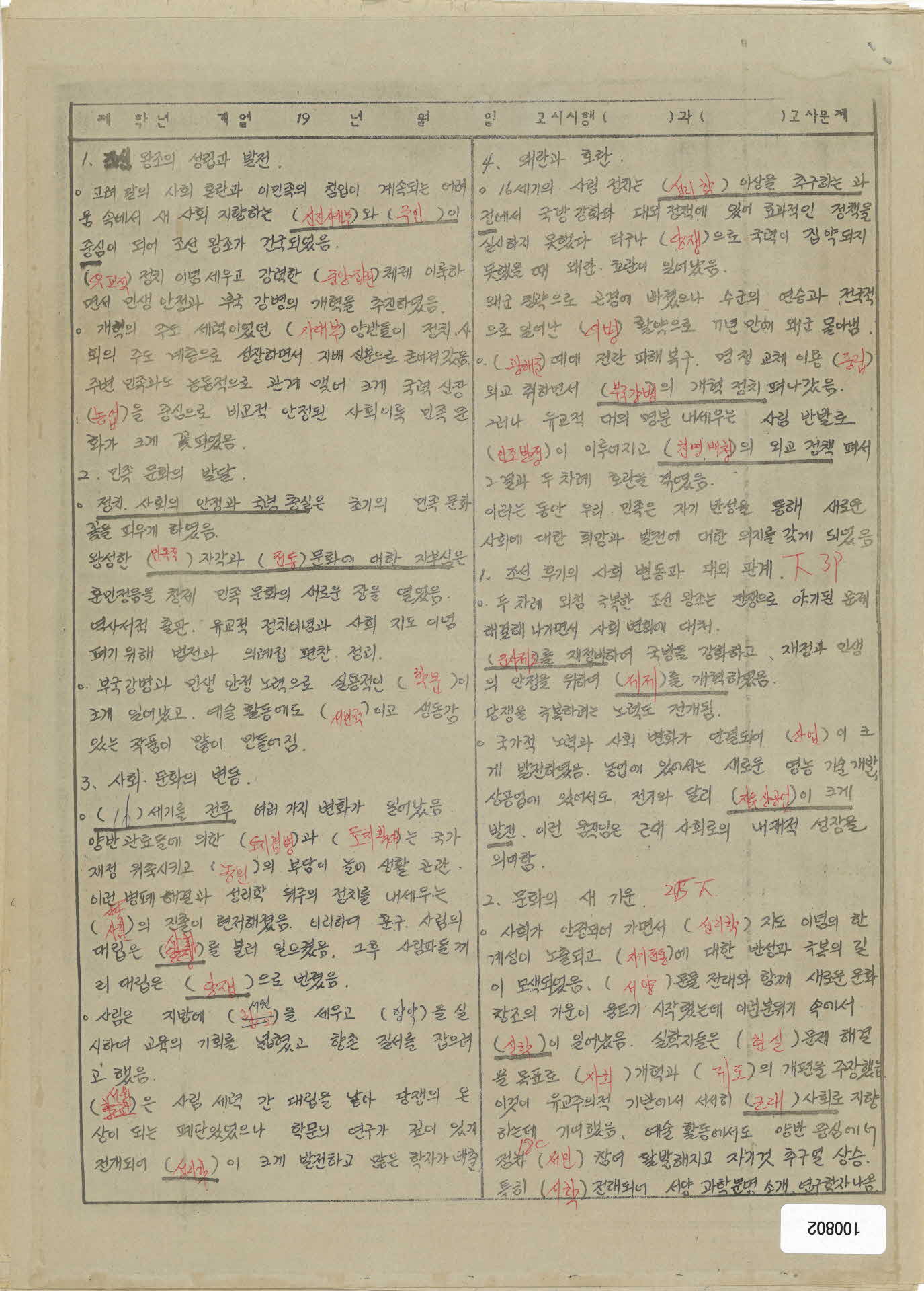 이 시험지(試驗紙)는 1987년 10월 27~29일까지 시행한 3학년 문과계열 학기말 고사 시험문제지로 총 16장이다.