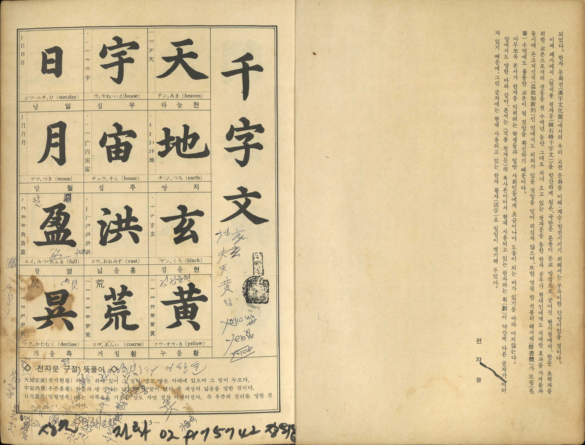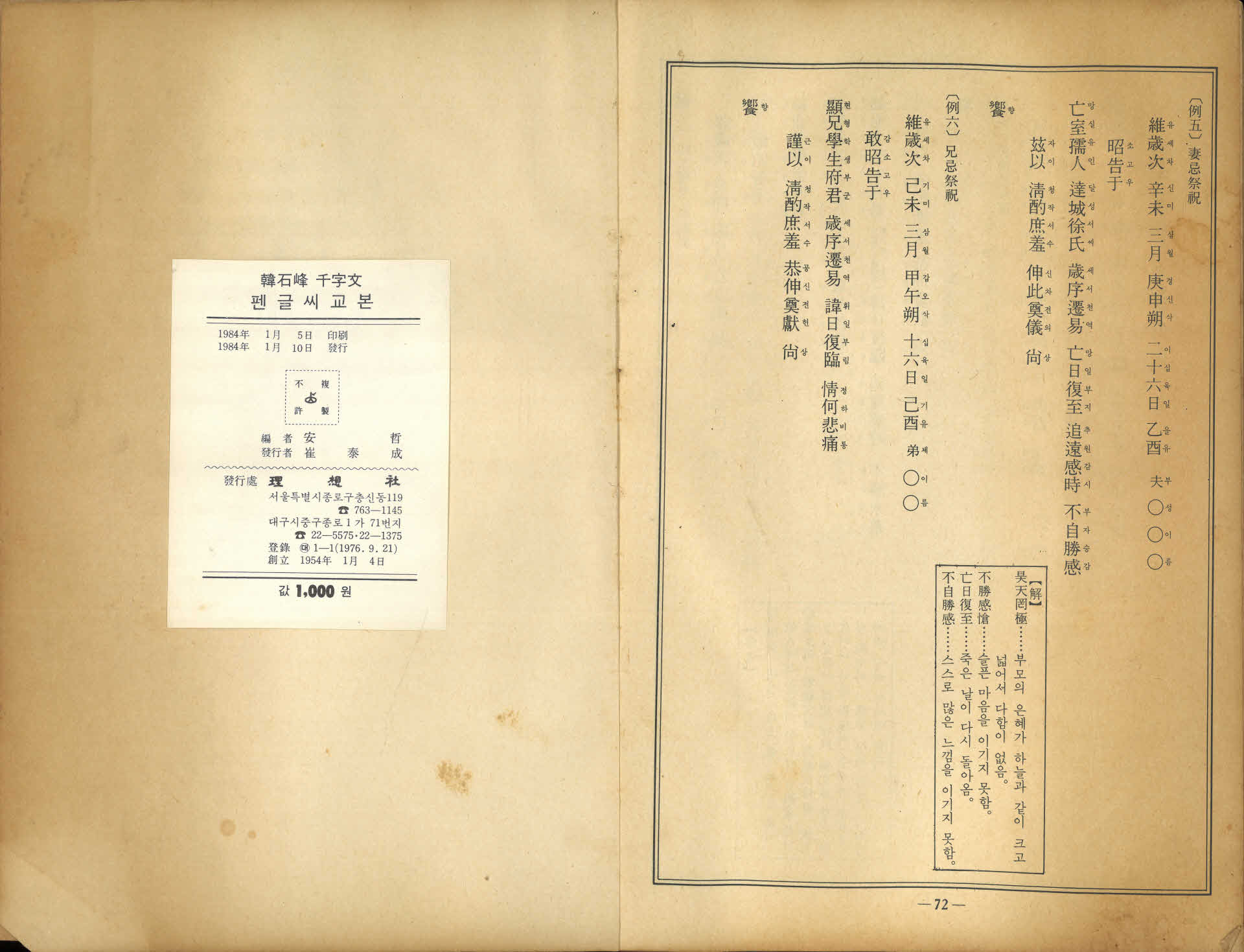 이 『한석봉천자문(韓石峰千字文)』 은 펜글씨교본으로 발행처(發行處)는 이상사(理想社)로 1984년 1월 10일 1000원에 발행되었다. 편자(編者) 안철(安哲)의 머리말을 시작으로 조선시대 명필 한석봉이 남긴 천자문을 정리한 것으로 오늘날 많이 사용하고 있는 한자와는 다른 글자들을 포함하고 있고 원본(原本)·해설(解說)이라 적혀있다. 각 한자마다 펜글씨로 필순을 명기하였으며 아래에는 천자문 구절 뜻풀이가 나와 있고 지방 쓰는 서식과 기제축 서식이 함께 수록되었다.