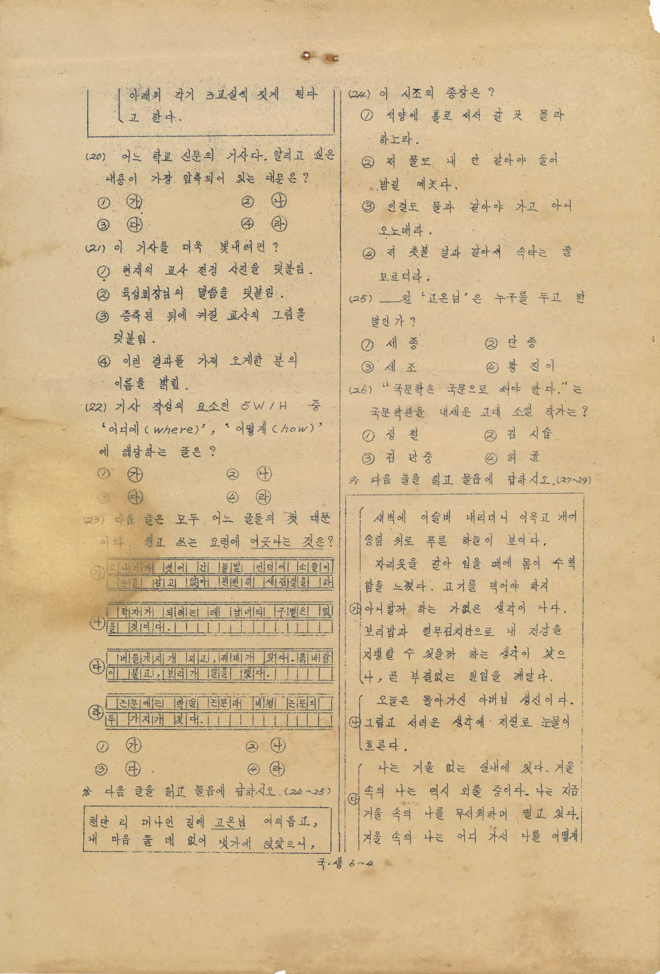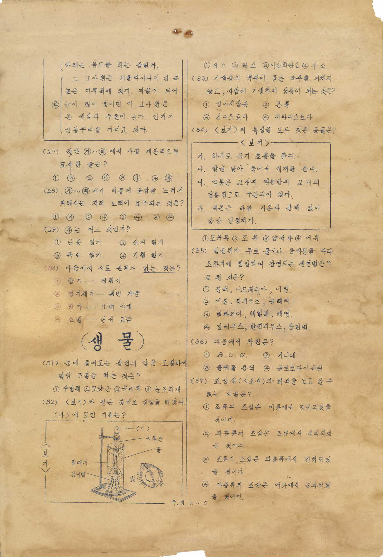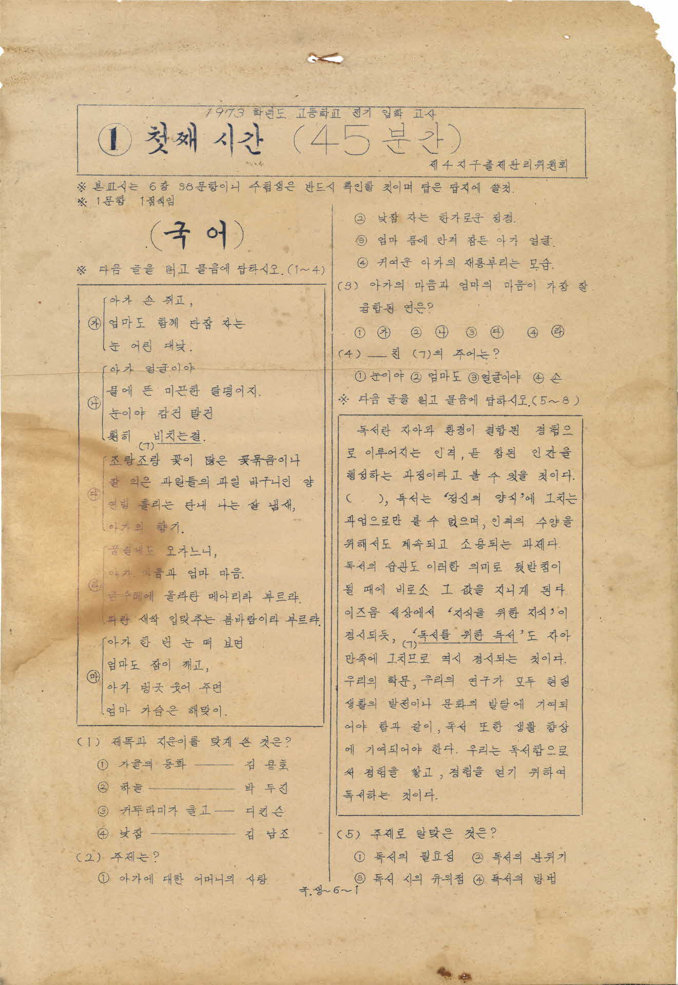 이 시험지는 제4지구 출제관리위원회에서 만든 1973학년도 고등학교 전기 입학고사 첫째시간 시험지이다. 시험과목은 국어, 생물 2과목으로 국어의 시험문항은 30문항이고 생물은 8문항이고 시험시간은 45분이다.