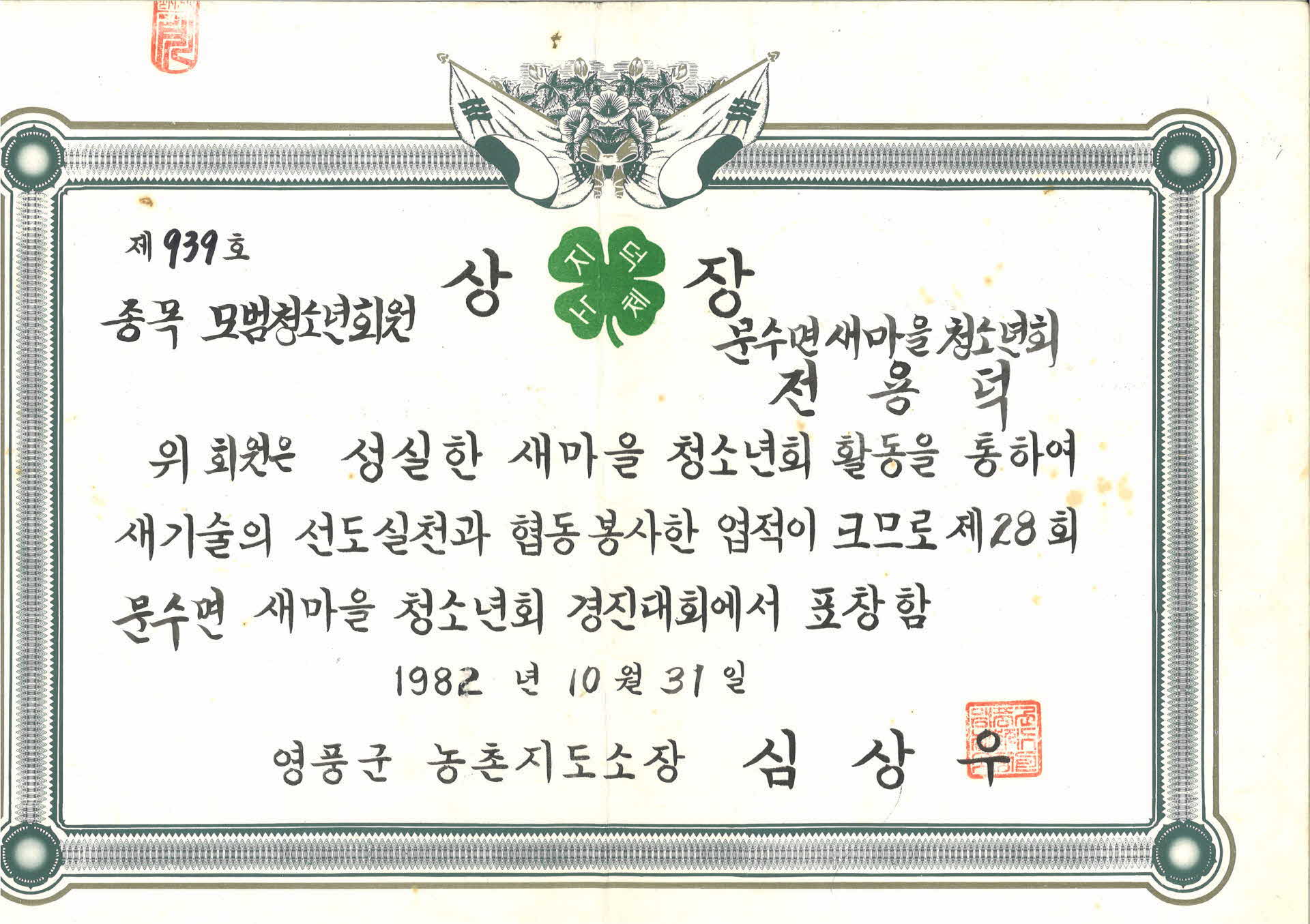 이 상장은 1982년 10월 31일 영풍군농촌지도소장 심상우가 성실한 새마을 청소년회 활동을 통하여 새기술의 선도 실천과 협동 봉사한 업적이 있어 제28회 문수면 새마을 청소년 경진대회에서 모범 청소년회원으로 수상한 문수면 새마을 청소년회 전용덕에게 발급한 것이다. 발급번호는 제939호이다.