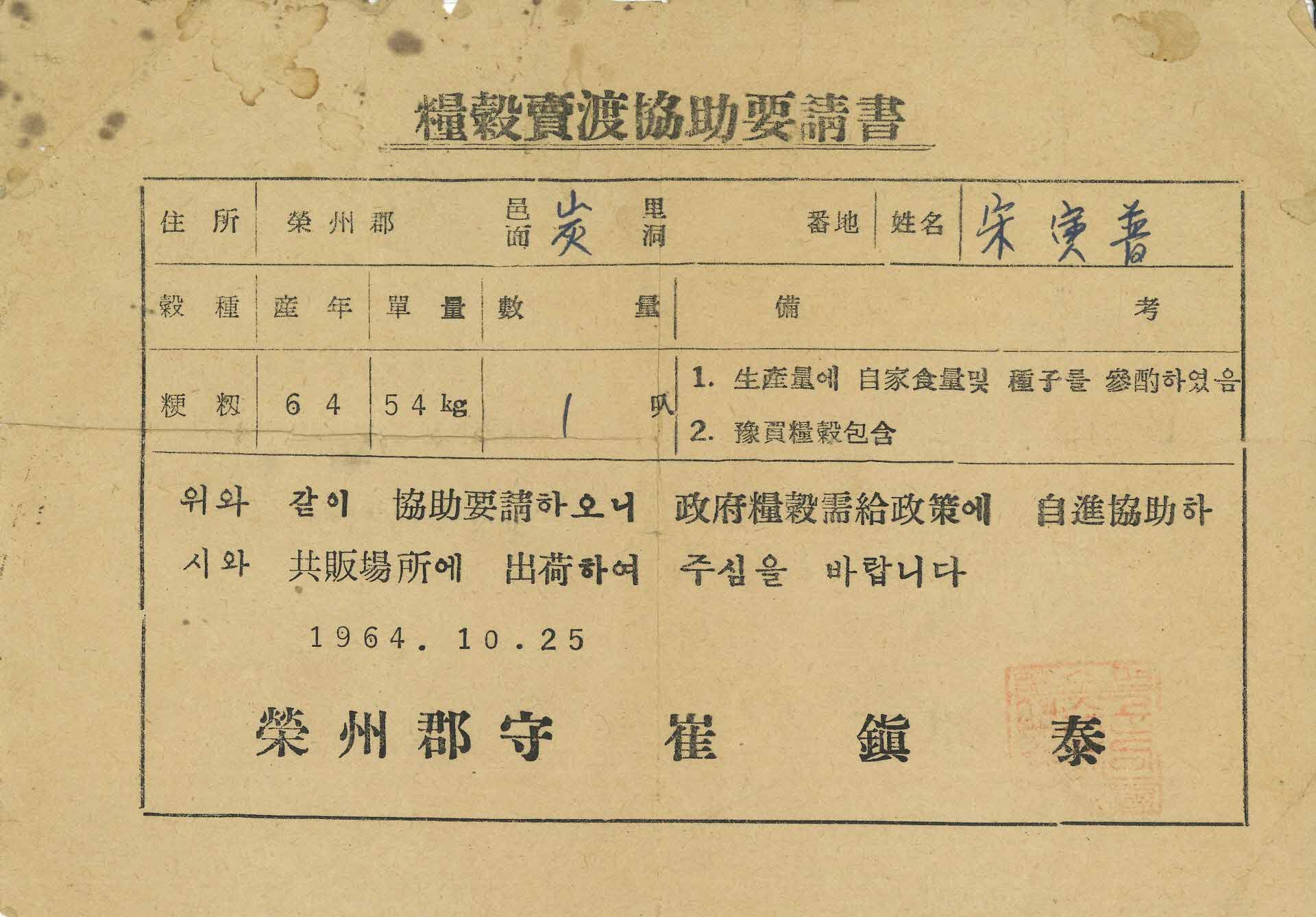 이 요청서는 1964년 10월 25일 영주군수 최진태가 송인선(宋寅善)에게 정부양곡 수요정책에 자진 협조하여 공판장소에 출하하여 줄 것을 요청하며 발급한 것이다.