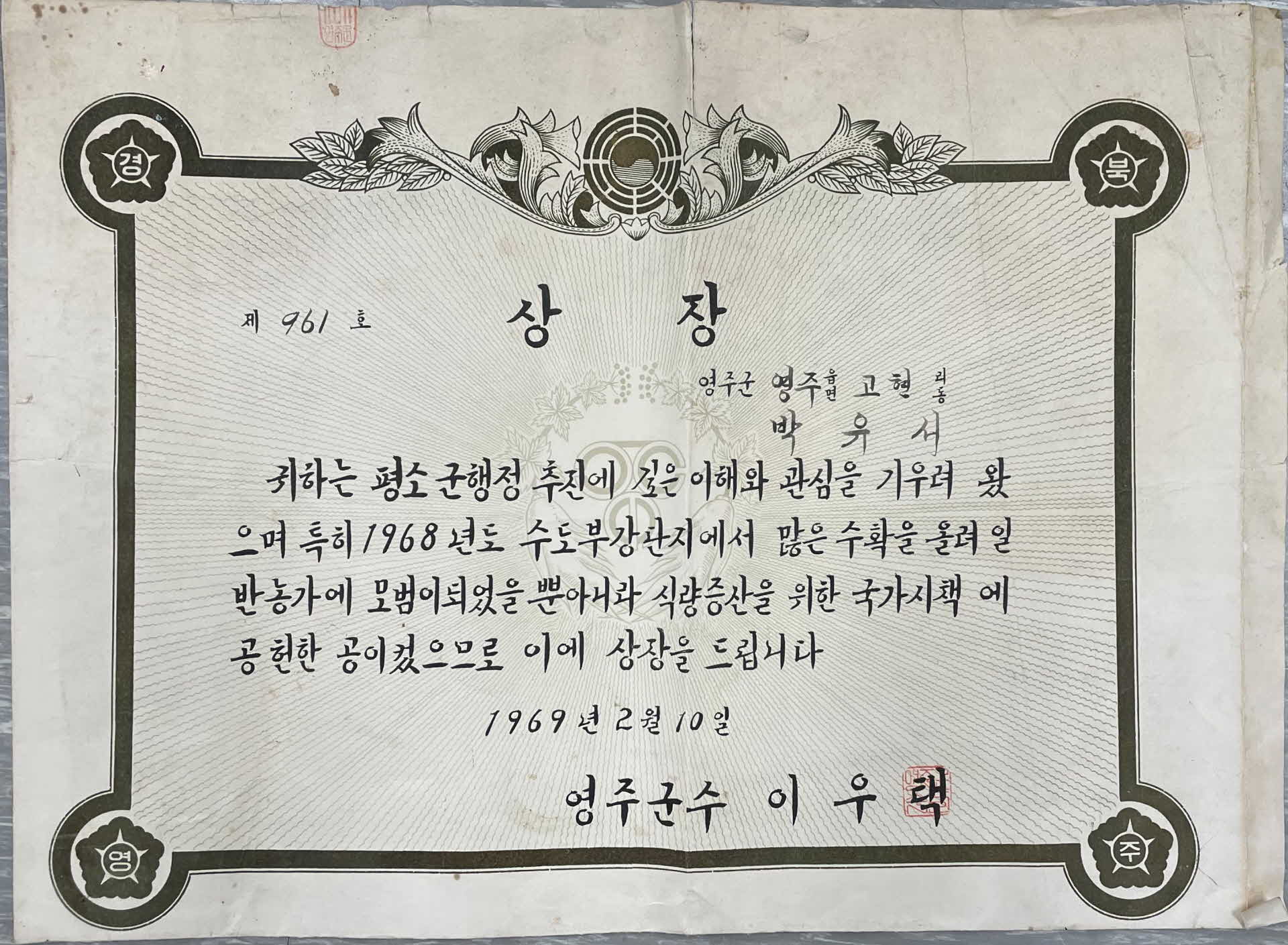 이 상장은 1969년 2월 10일 영주군수 이우택이 평소 군행정 추진에 깊은 이해와 관심을 갖고 특히 1968년도 수도부강단지에서 많은 수확을 올려 일반농가에 모범이 되었으며 식량증산을 위한 국가시책에 공헌한 영주군 영주읍 고현리의 박유서에게 발급한 것이다. 발급번호는 제961호이다.