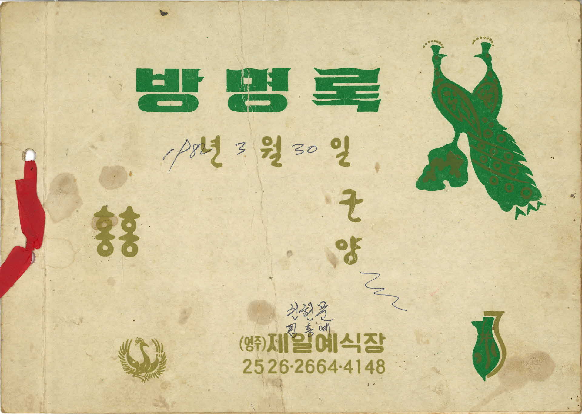 이 방명록(芳名錄)은 1982년 3월 30일 영주 제일예식장에서 성혼한 신랑 권헌문과 신부 김홍예의 결혼식(結婚式) 방영록이다. 5쪽인 방명록에는 권헌갑 등 114명이 올라 있다. 성명(姓名), 금액(金額), 비고(備考) 등이 기록되어 있다. 영주 제일예식장은 지금은 남아 있지 않다.
