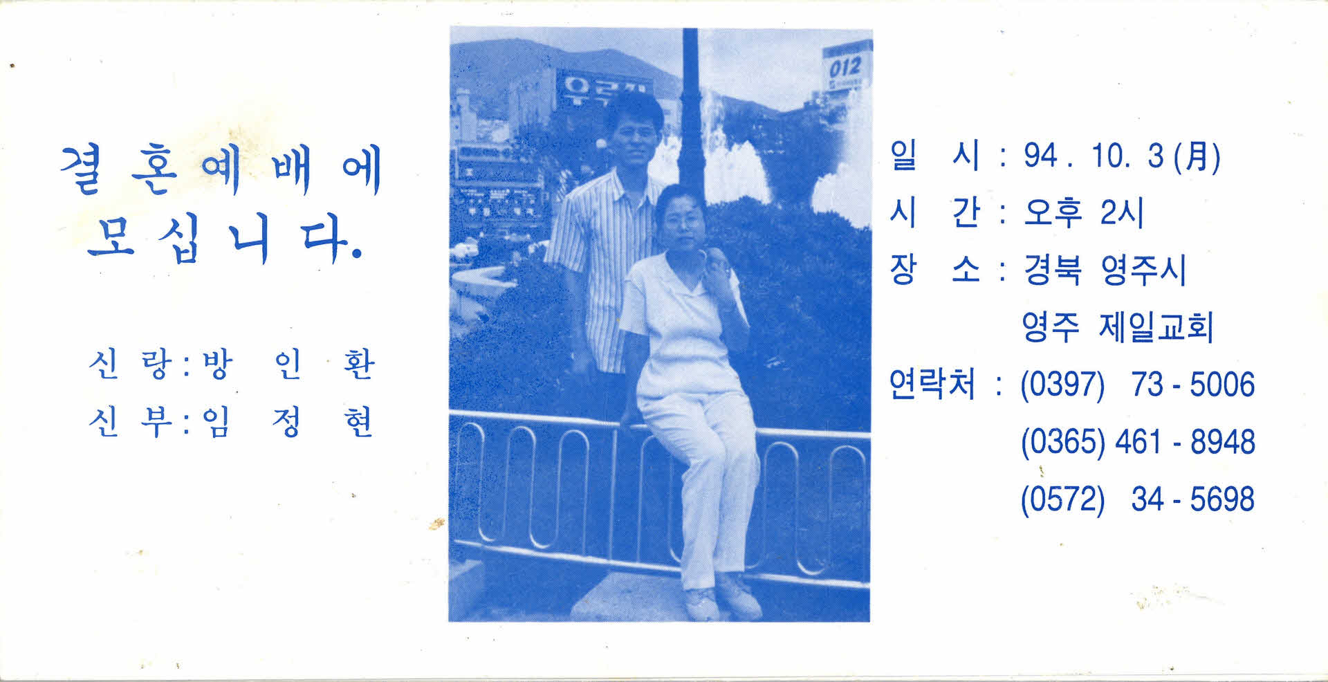 이 초청장은 1994년 10월 3일 오후 2시에 영주 제일교회에서 신랑 방인환과 신부 임정현의 결혼식 초청장이다. 이 초청장에는 신랑 신부의 사진, 모시는 글과 성경구절, “기도는 가장 진한 사랑의 표현입니다,”라는 경구가 수록되어 있다.