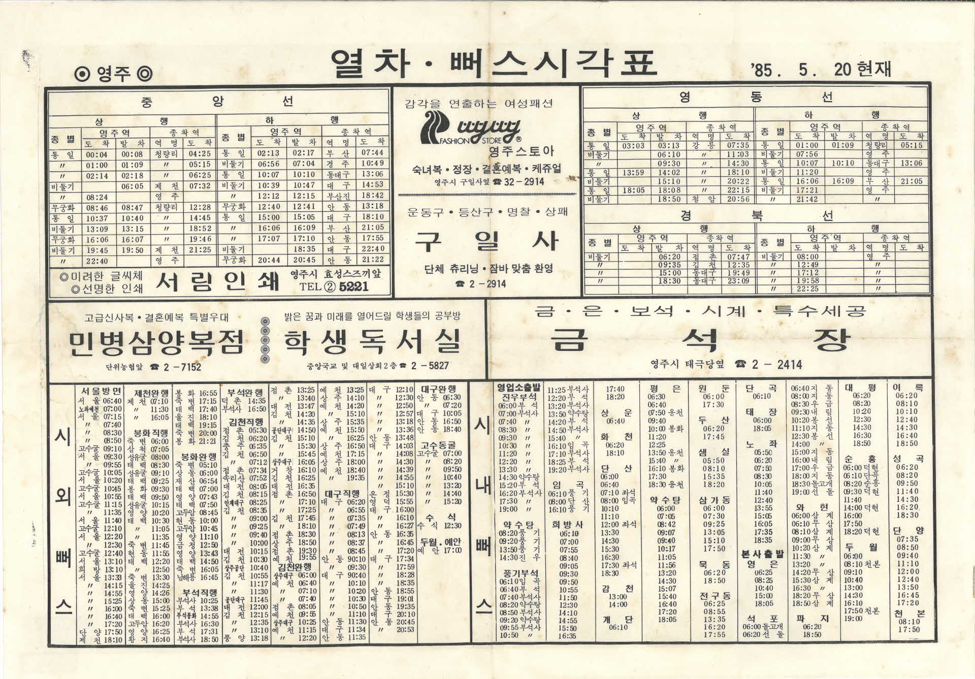 이 시각표는 1985년 5월 20일 현재 영주지역의 열차⸱뻐스시각표이다. 열차는 중앙선과 영동선, 경북선의 시각표이고 버스는 시외뻐스와 시내뻐스 시각표이다. 당시 시외뻐스는 서울, 제천, 봉화, 부석, 김천, 대구, 고수동굴, 수식, 두월, 예안 노선이 있었다.