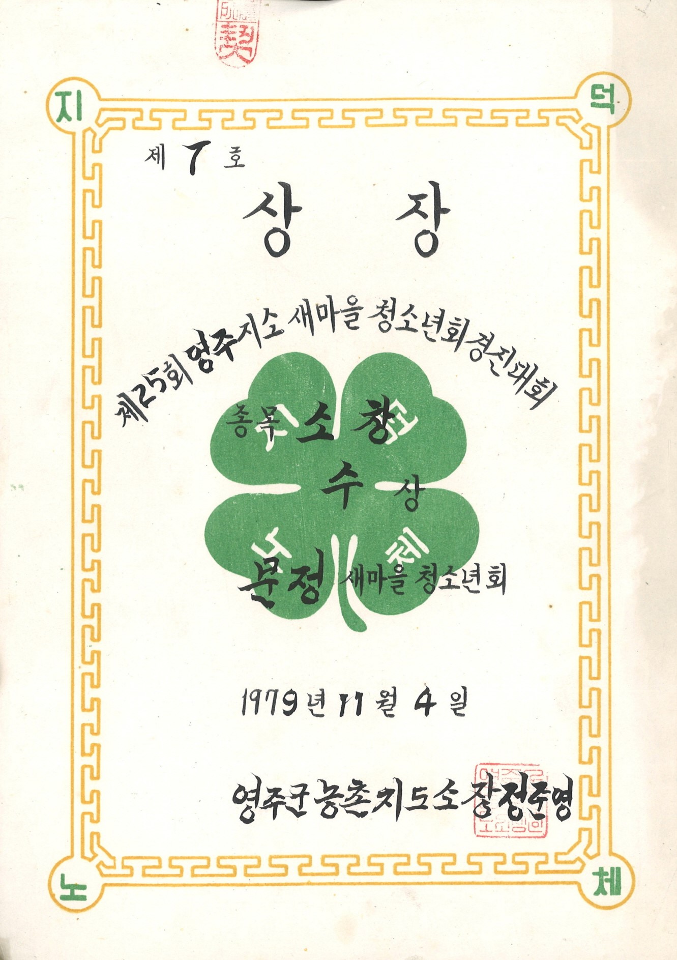 1979년 11월 4일자 영주군농촌지도소장 정준영의 명의로 발행한 상장이다. 상장은 제25회 영주지소 새마을 청소년회 경진대회 중 소창 종목에서 문정 새마을 청소년회가 수상한 것이다.