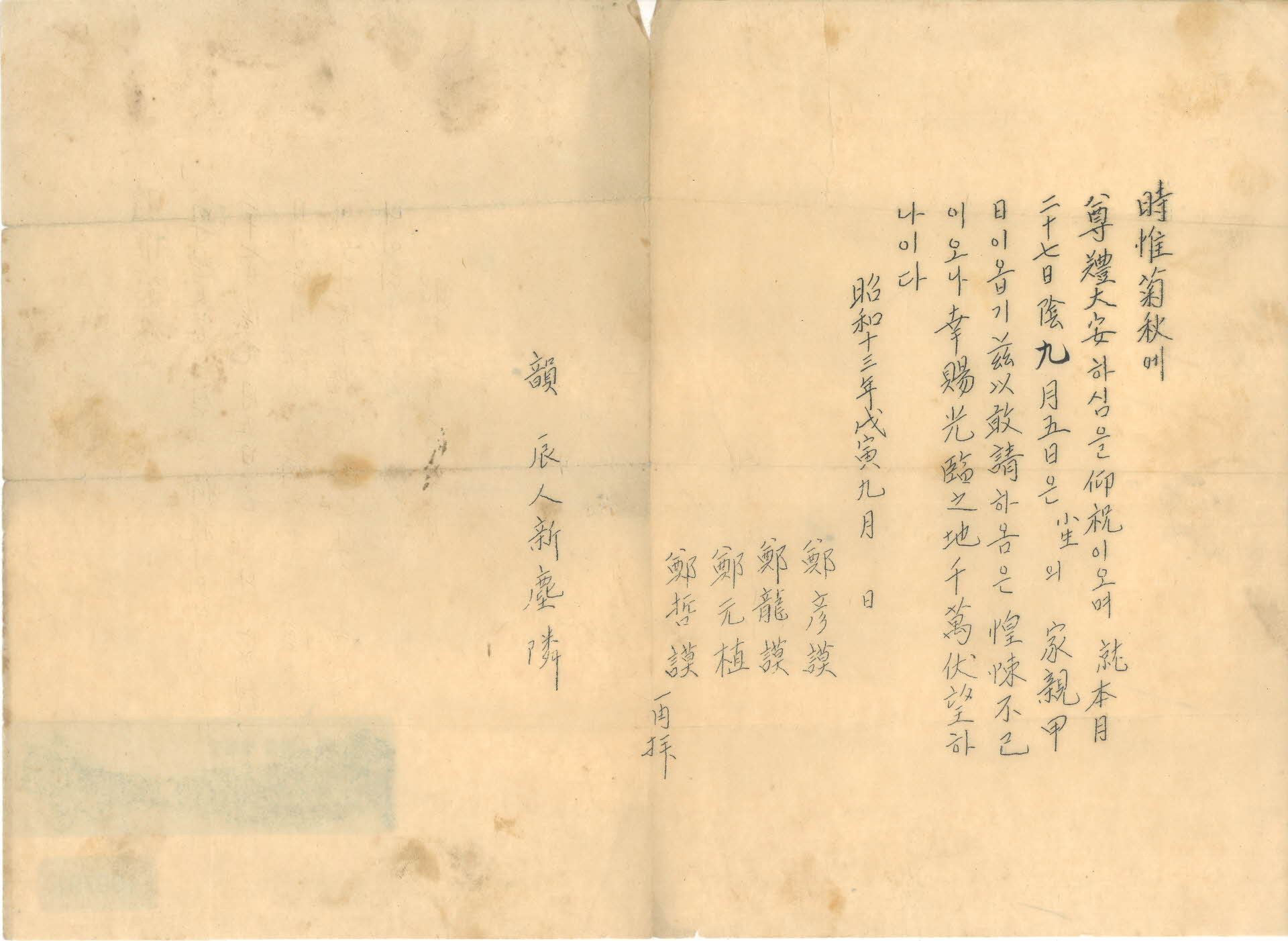 1938년 9월 27일(음 9월 5일) 회갑연에 초청하는 청첩장이다.