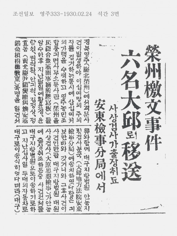 경북 영주에서 격문사건이 발생하여 20여명의 주의자를 검거하는 동시에 30여의 가택을 수색하고 영주농민조합 풍기면사무소 등사판를 완수한 후 지난 8일 황윤경, 윤양섭, 권석환, 안기석, 김정상, 정효동 6명을 일건 서류와 함께 대구지방법원 안동지청 검사분국에 송치하였다함은 기보한바와 같거니와 그후 사건이 사건인 만큼 대구지방법원 대원 사상 검사가 안동에 출장 취조하는 등 사건 전체를 대구지방법원으로 이송하기로 하고 지난 4일 2대의 자동차로 대구로 이송히였다더라