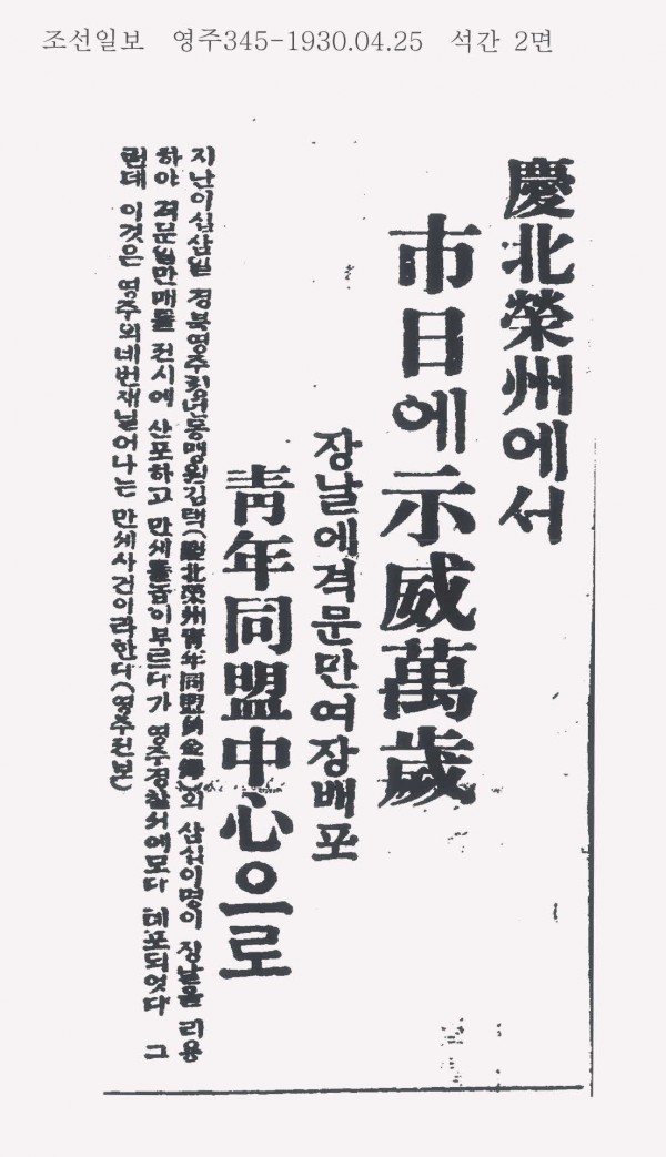 지난 23일 경북 영주청년동맹원 김 택 외 30여명이 장날을 이용하여 격문 1만매를 전시에 산포하고 만세를 높이 부르다가 영주경찰서에 모두 체포되었다. 그런데 이것은 영주의 네 번째 일어나는 만세 사건이라한다.