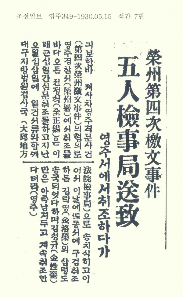 기보한바 제4차 영주격문사건의 혐의로 영주경찰서에서 취조를 받아 오던 전정식(全正錫)은 근 10일간 심문취조를 하고 지난 5월 13일에 일건서류와 함께 대구지방법원검사국으로 송치시키고 이어서 이날에 또 동시에 구검취조하던 김낙영 외 3명도 송국되었다하며 김성규만은 아직 남겨 두고 계속 취조 한다더라.