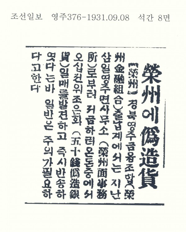 영주에 위조화(僞造貨) 페이지 정보 본문 경북 영주금융조합 출납계에서는 지난 3일 영주면사무소로 부터 저금하러 온 돈중에서 50전 위조 은화(銀貨) 1매를 발견하고 즉시 반송하였다는바 일반은 주의가 필요하다고 한다. 오류신고 목록 이전글 아들 작첩비관(作妾悲觀)코 노파투강자살(老婆投江自殺) 영주읍 서천(西川)에서 다음글 영주 문수면에 흉기(凶器) 가진 복면강도(覆而强盜) 식도와 곤봉으로 위협, 범인종족오리무중(犯人踪跡五里霧中)