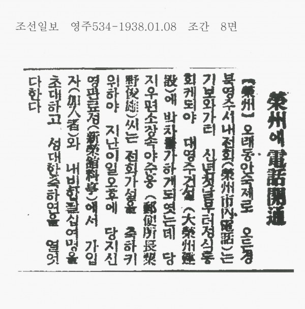 영주에 전화개통(電話開通) 페이지 정보 본문 오래동안 숙제로 오던 경북 영주시내 전화는 기보와 같이 신년 첫날부터 정식 통화케되어 대영주건설에 박차를 가하게 되었는데 당지 우편소장 속야준웅(粟野俊雄)씨는 전화가설을 축하키 위하야 지난 2일 오후에 당지 신영관료정(新榮館料亭)에서 가입자와성대한 축하연을 열었다. 내빈 합 80여명을 초대하고 성대한 축하연을 열었다. 오류신고 목록 이전글 10명의 시체발굴(屍體發掘) 다음글 중앙선 영주역(中央線 榮州驛) 기지매수착수(基地買收着手)