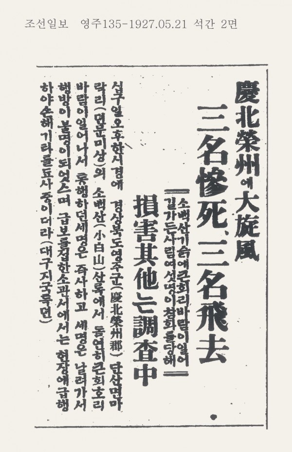 19일 오후 1시경에 경상북도 영주군 단산면 마락리(현문 미상)의 소백산(小白山) 산록에서 돌연히 회오리 바람이 일어나서 통행하던 3명은 즉사하고 3명은 날려가서 행방이 불명이되었으며 급보를 접한 소관서에서는 현장에 급행하야 손해 기타를 조사중이더라.