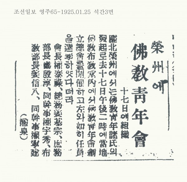 영주에 불교청년회(佛敎靑年會) 17일에 조직 페이지 정보 본문 경북 영주에서는 불교청년 제씨(諸氏)의 발기로 17일 오후 2시에 불교포교당내에서 불교청년회 창립총회를 개최하고 아래와 같이 임원을 선출하였다더라. 오류신고 목록 이전글 영주에서 중견부인강습(中堅婦人講習) 다음글 윷놀이가 치안방해(治安妨害)라고 영주경찰의 명령