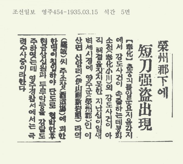 영주 군하(郡下)에 단도강도(短刀强盜) 출현