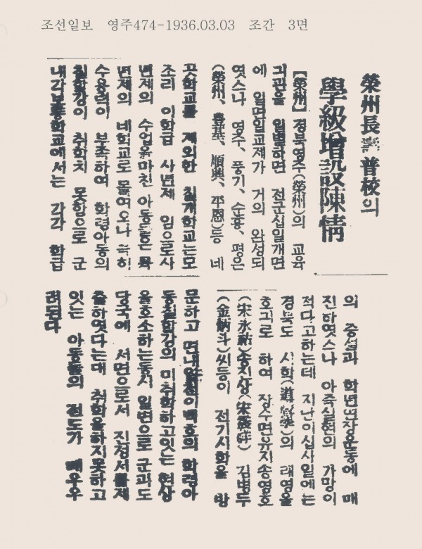 경북 영주의 교육기관을 일별하면 전군 11개면에 일면일교제가 거의 완성되었으나 영주, 풍기, 순흥, 평은 등 네곳 학교를 제외한 7개학교는 모조리 2학급 4년제 임으로 4년제의 수업을 마친 아동들은 6년제의 4학교로 몰려오나 수용력이 부족하여 학령아동의 칠팔강이 취학치 못함으로 군내 각 보통학교에서는 각각 학급의 증설과 학년연장운동에 매진하였으나 아주 실현의 가망이 적다고 하는데 지난 24일에는 경북도 시학의 래영을 호기로하여 장수면 유지 송영호, 송진상, 김병두 씨 등이 전기 시학을 방문하고 면내 1,200호의 학령아동 칠팔강의 미취학하고 있는 현상을 호소하는 동시에 일변으로 군과도 당국에 서면으로서 진정서를 제출하였다는데 취학을 하지 못하고