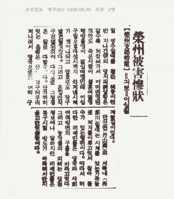 27일 영수일대를 휩쓴 해풍이 한번 지나간 뒤의 피해상황은 갈수록 처참해서 이미 판명된 것만도 죽은 사람이 38명, 행방 불명이 80여명인데 29일 오후 5시까지 찿아낸 시체가 셋이나 되고 앞으로도 자꾸 발견될것갔다. 그리고 온 집안 식구가 전멸된것이 다섯으로 그 정경은 말로 다할 수 없다. 산가까이 있는 촌락은 산이 자꾸 허무러져 내려서 당국으로서도 어찌 구제할 길이 없었다. 단산면의 서쪽내 일대는 시체를 찾는 가족들로 저자들 이루고 있어 참아 볼 수가 없는 형편이다. 따라서 허다한 이재민들은 당국과 사회 여러 방면의 구휼을 바라고 있다. 그리고 농작물의 피해는 3천 정보에 달하지만 이재민들을 복구시킬 방도가 아득해서 단지 울고만 있을 뿐이다.