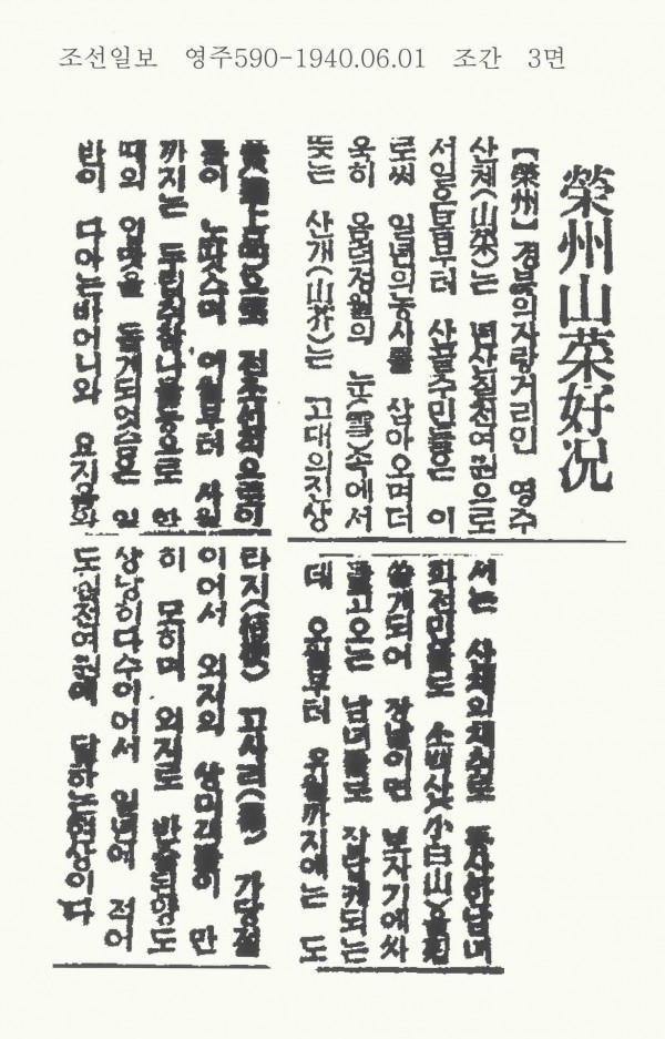 경북의 자랑거리인 영주 산채(山菜)는 년 생산 7천여원으로서 이른 봄부터 산골 주민들은 이로써 일년의 농사를 삼아오며 더우기 음력 정월의 눈속에서 뜯는 산개(山芥)는 고대의 진상품으로 전 조선적으로 이름이 높았으며 2월부터 4월까지는 두릅취, 참나물 등으로 한때의 입맛을 돌게되었으므로 일반이 다아는바 요즈음와서는 산채의 체취로 등산한 남녀 화전민들도 소백산을 휩쓸게되어 장날이면 보자기에 싸들고 오는 남녀들도 정답게 되는 5월부터 6월까지는 도라지, 고사리의 절기이어서 외지 사람들이 모이며 외지로 방출된 양도 상당하다. 일년에 적어도 삼천여원에 달하는 현상이다.