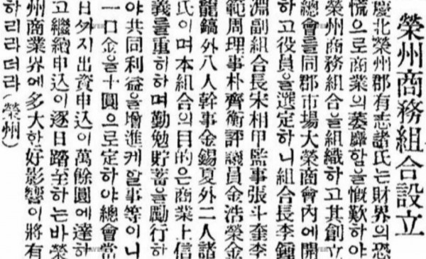 경북 영주군 유지 제씨는 재계의 공황으로 상업의 위미함을 개탄하여 영주상무조합을 조직하고 그 창립 총회를 동군 시장 대영상회(大榮商會) 내에서 열고 역원을 선정하니 조합장 이종연(李鍾淵), 부조합장 송상갑(宋相甲), 감사 장두규(張斗奎), 이범주(李範周), 이사 박제형(朴齊衡), 평의원 김호영(金浩榮), 김용호(金龍鎬) 외 8인, 간사 김석하(金錫夏) 외 2인 제씨이며 본조합의 목적은 상업상 신의를 증진케 할 사 등이니 일구금을 10원으로 정하여 총회 당일까지 출자 신입이 만여 원에 달하고 계속 신입이 축일 답지하는 바 영주상업계에 다대한 좋은 영향이 장유(將有)하리라더라.